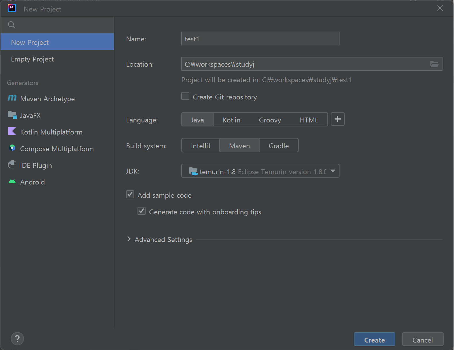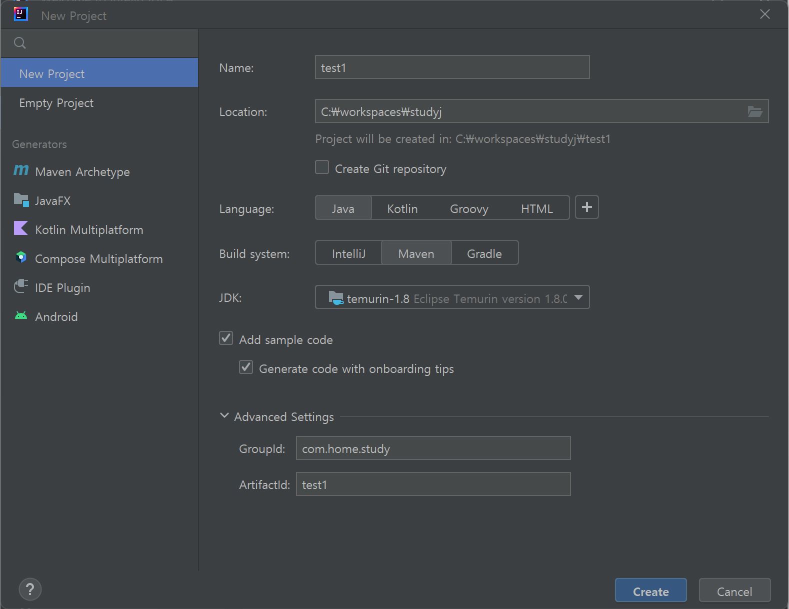 저는 프로젝트 이름(Name)을 "test1"로 입력하였습니다.