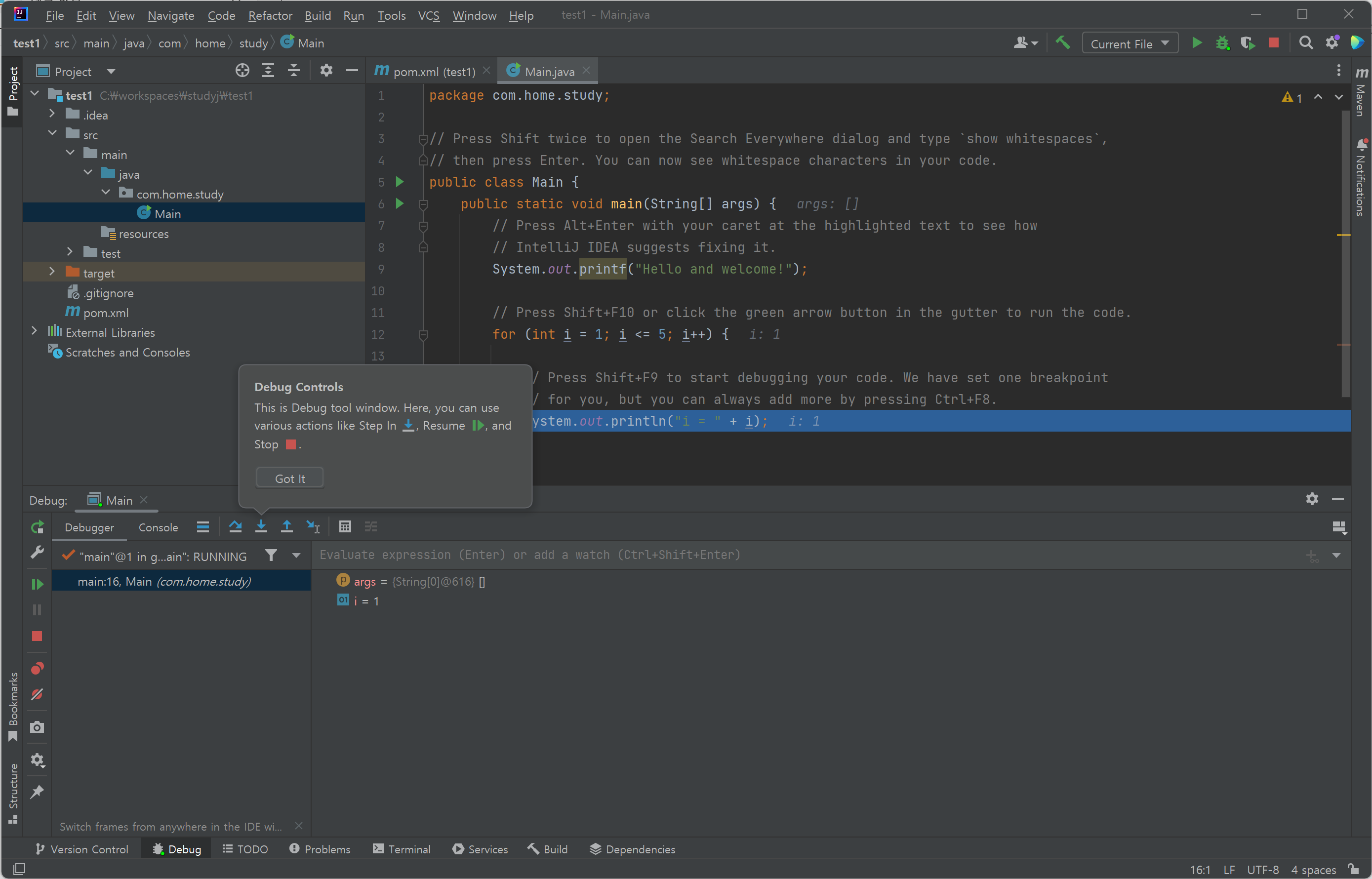 디버그 컨트롤(Debug Controls) 설명 상자는 "Got it"를 누르면 사라집니다.