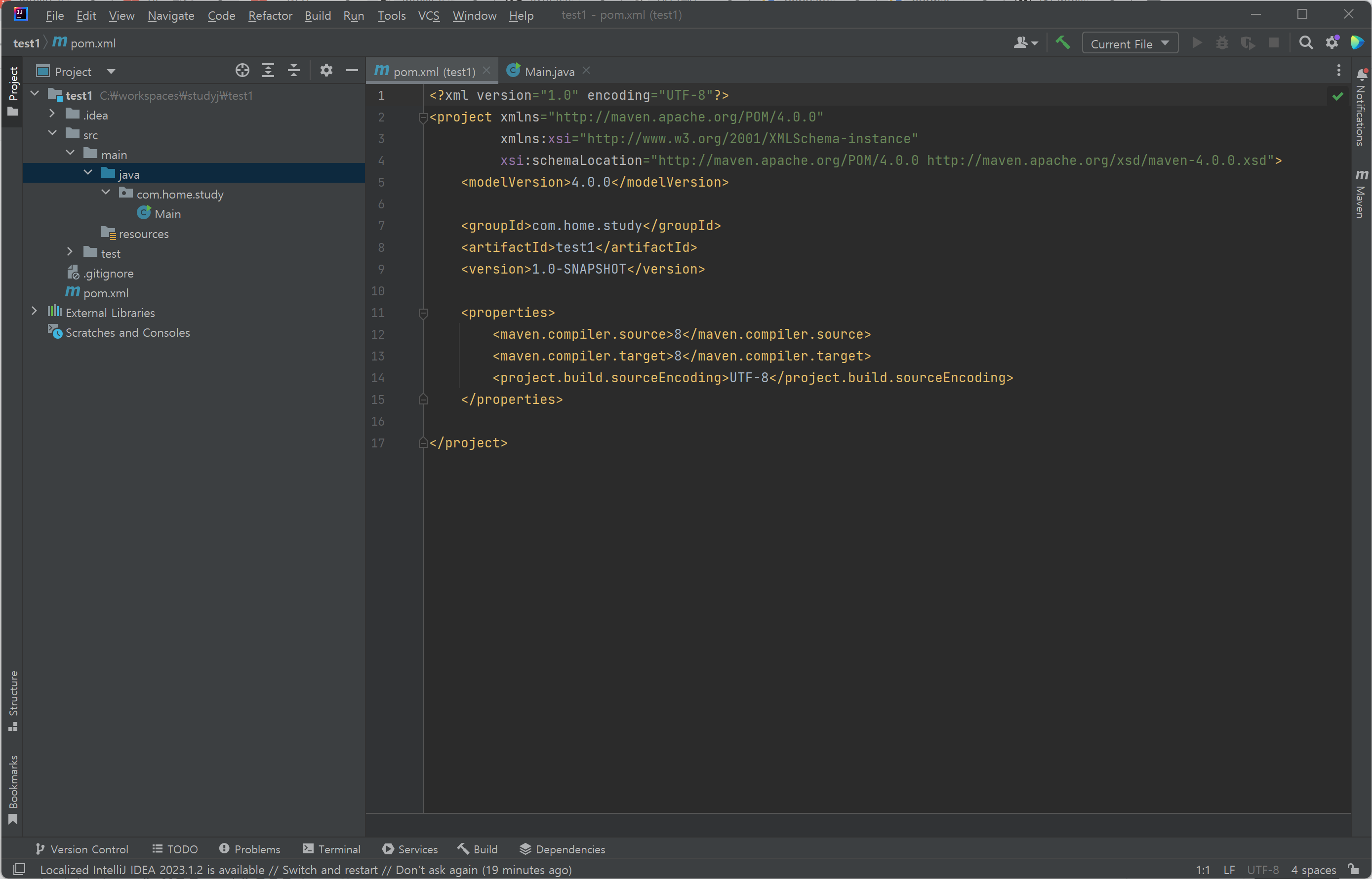 그리고 pom.xml를 보면 New Project 대화상자에서 설정한 정보들로 설정된 것을 확인할 수 있습니다.