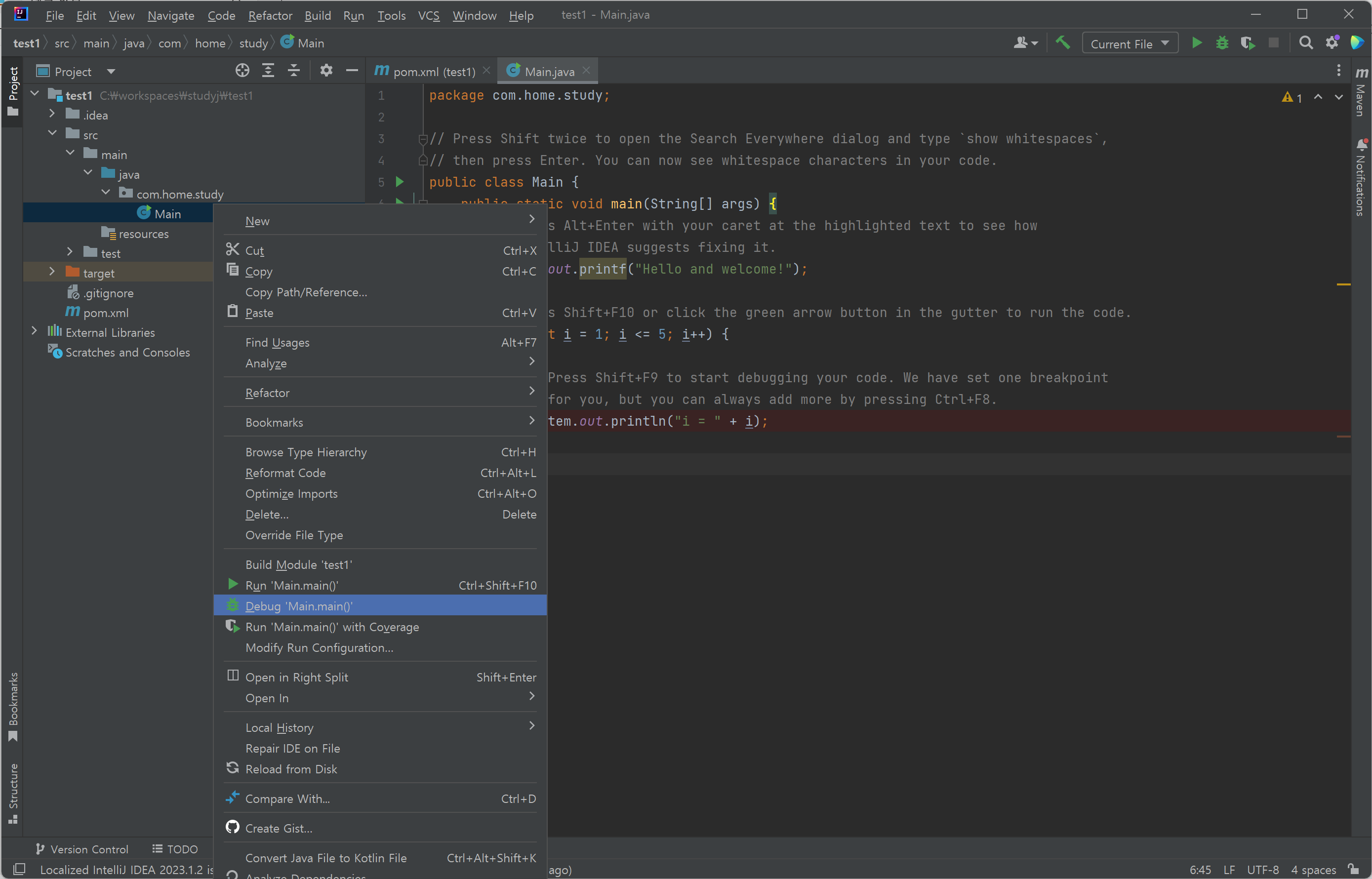 1. intelliJ IDE에서 "Main.java" 파일에서 마우스 오른쪽 버튼을 눌러 콘텍스트 메뉴에서 "Debug 'Main.main()'"를 클릭합니다.