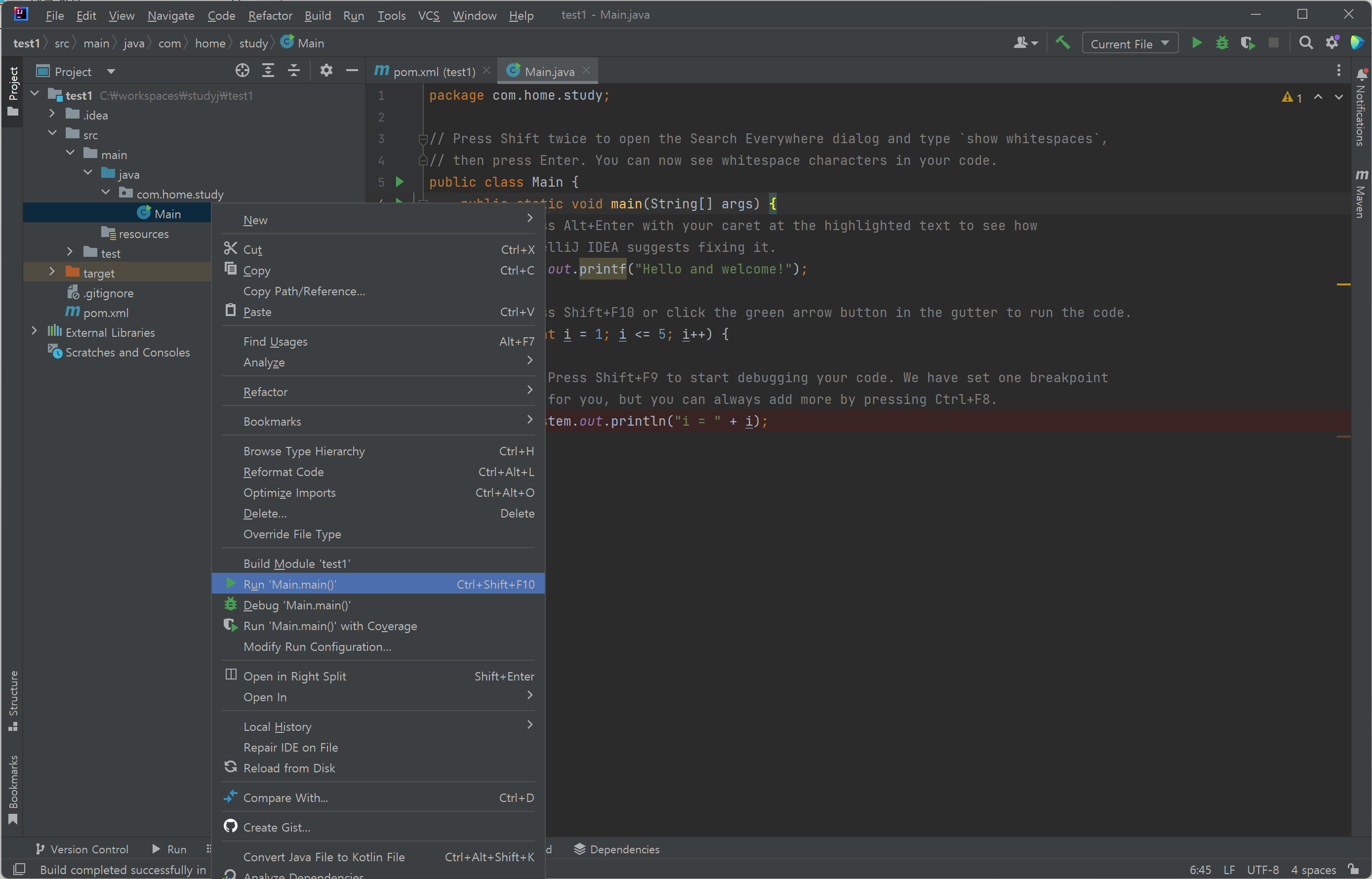1. intelliJ IDE에서 "Main.java" 파일에서 마우스 오른쪽 버튼을 눌러 콘텍스트 메뉴에서 "Run 'Main.main()'"를 클릭합니다.