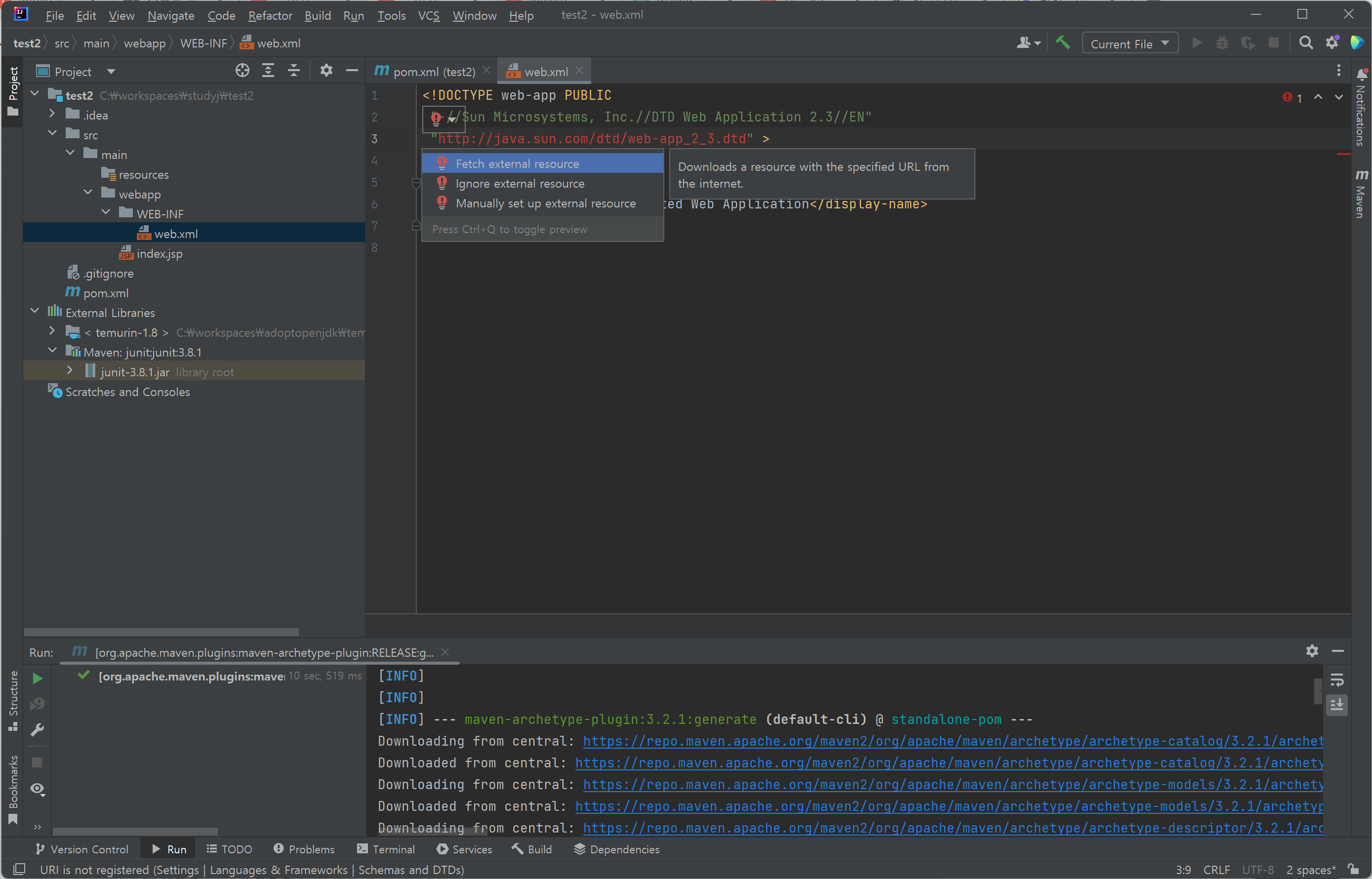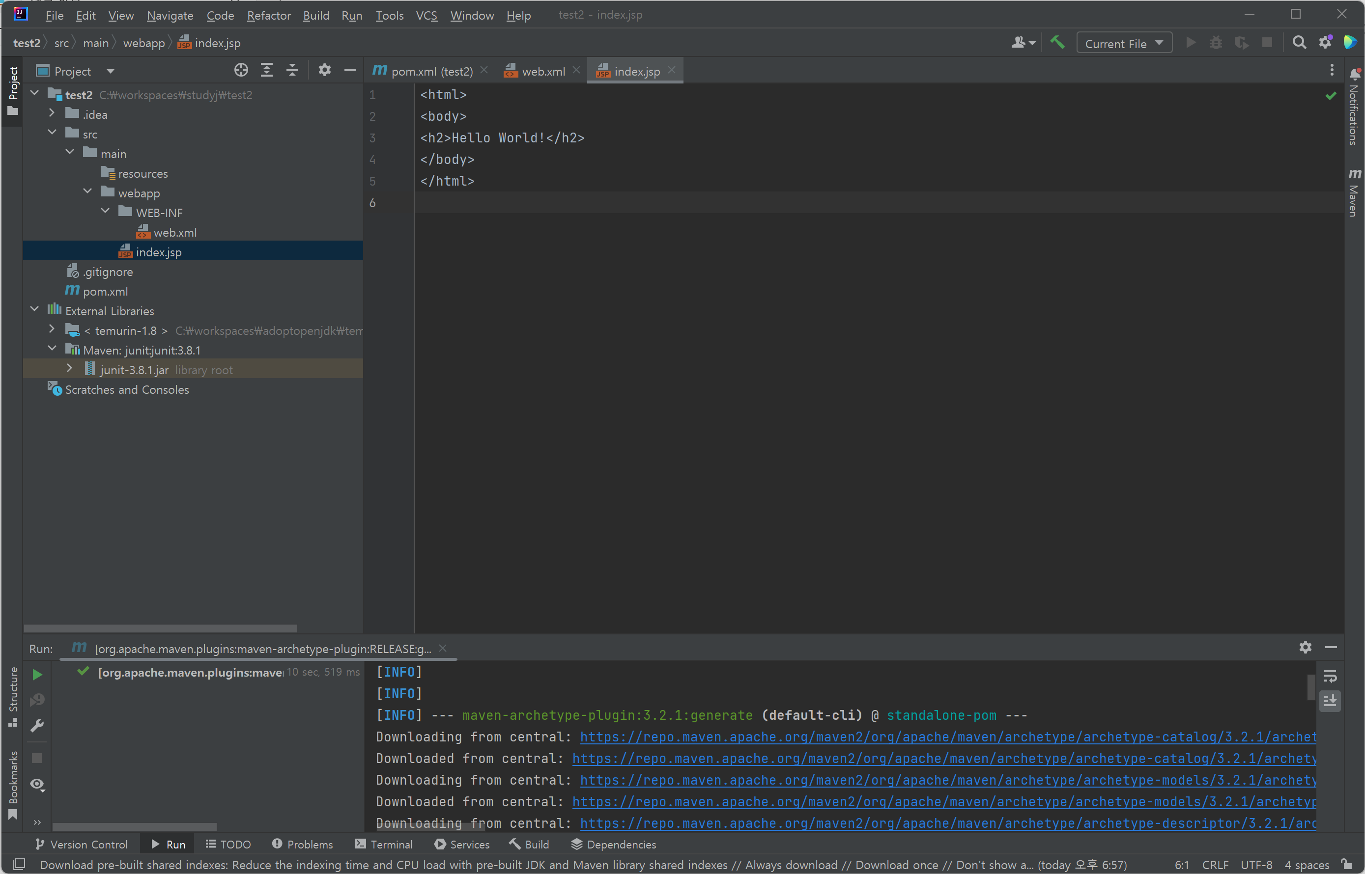 프로젝트가 생성되자마자 maven-archetype-plugin-3.2.1을 다운로드하고 plugin과 관련된 모듈들을 다운로드합니다.