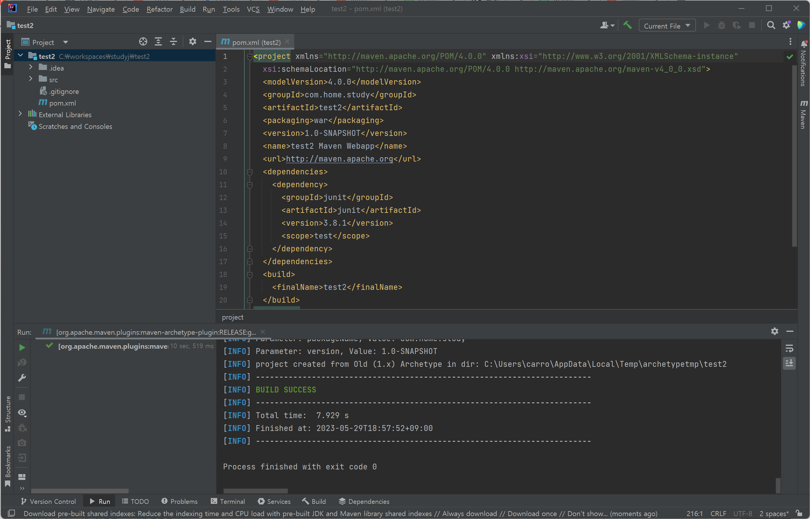 pom.xml를 보면 New Project 대화상자에서 설정한 정보들로 설정된 것을 확인할 수 있습니다.