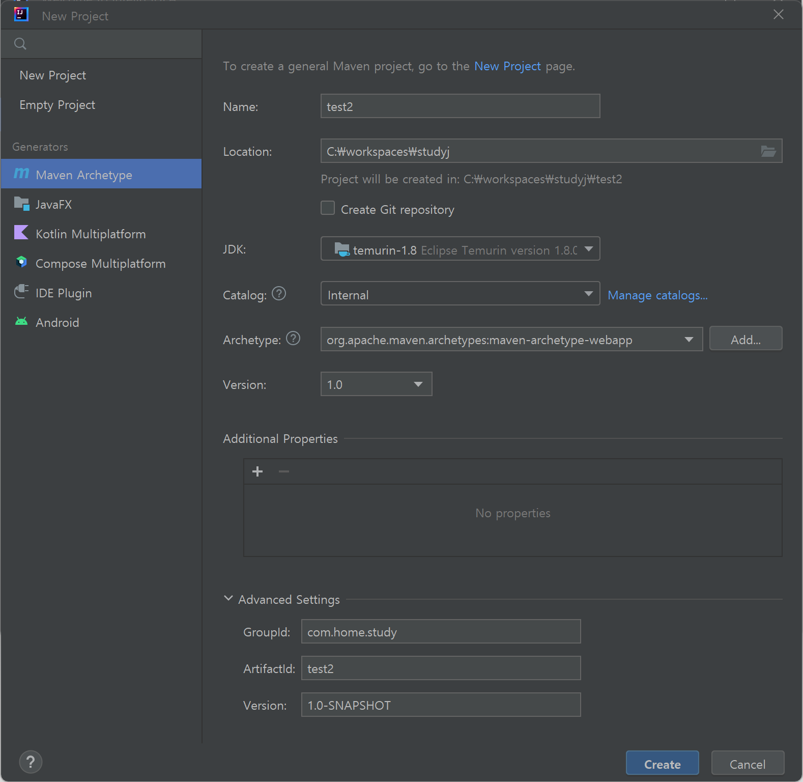 (메이븐 아키타입(Archetype)은 메이븐 카탈로그(Catalog)에 따라 달라집니다.)