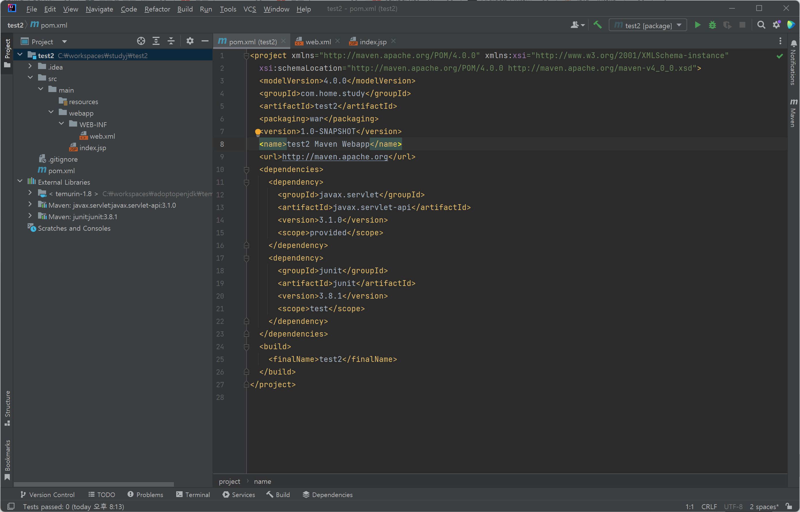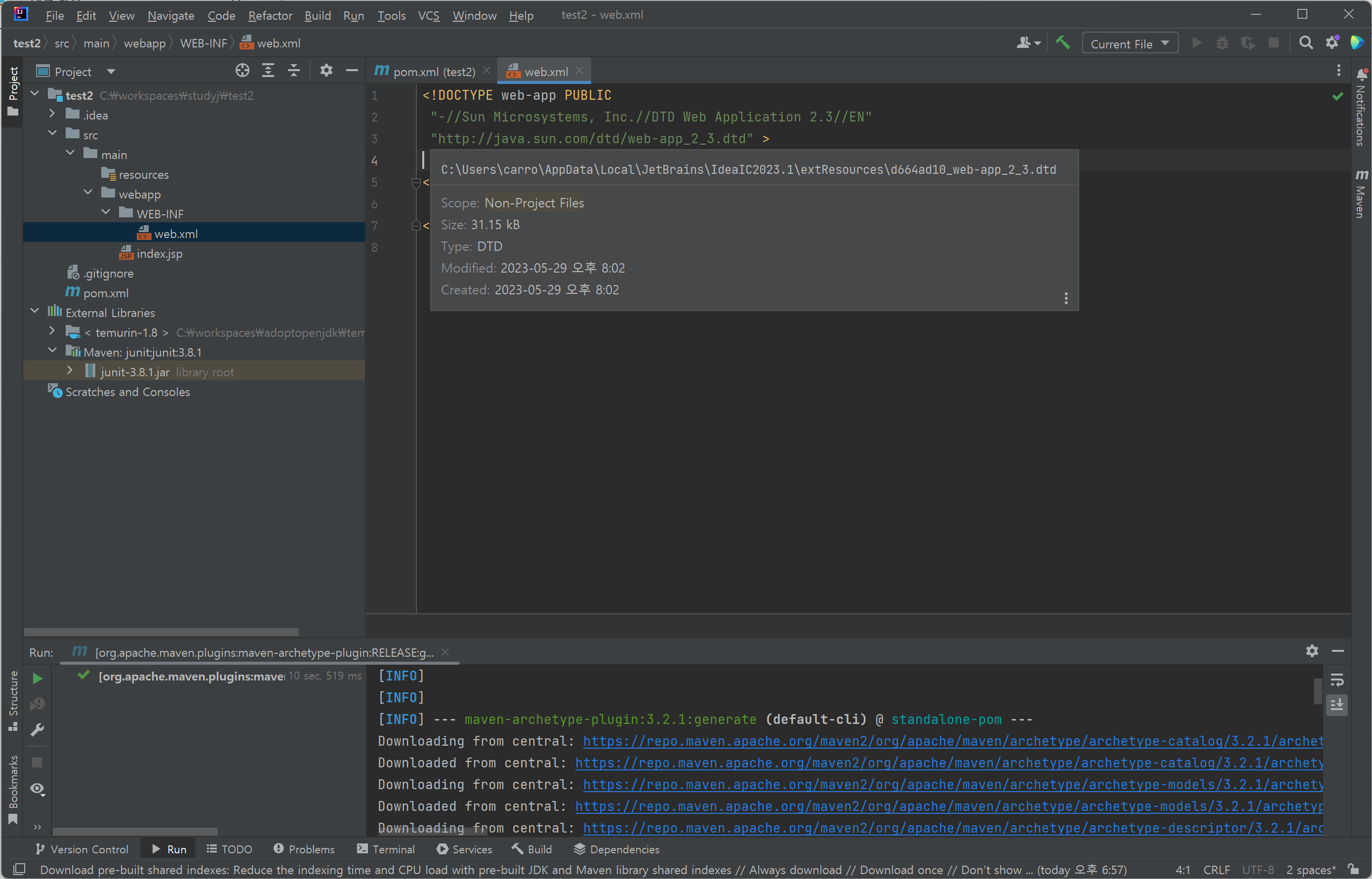 web.xml에는 간단히 웹앱의 이름으로 "Archetype Created Web Application - 아키타입으로 만들어진 웹 애플리케이션"으로 되어 있습니다. 원하시는 이름으로 변경하면 됩니다.