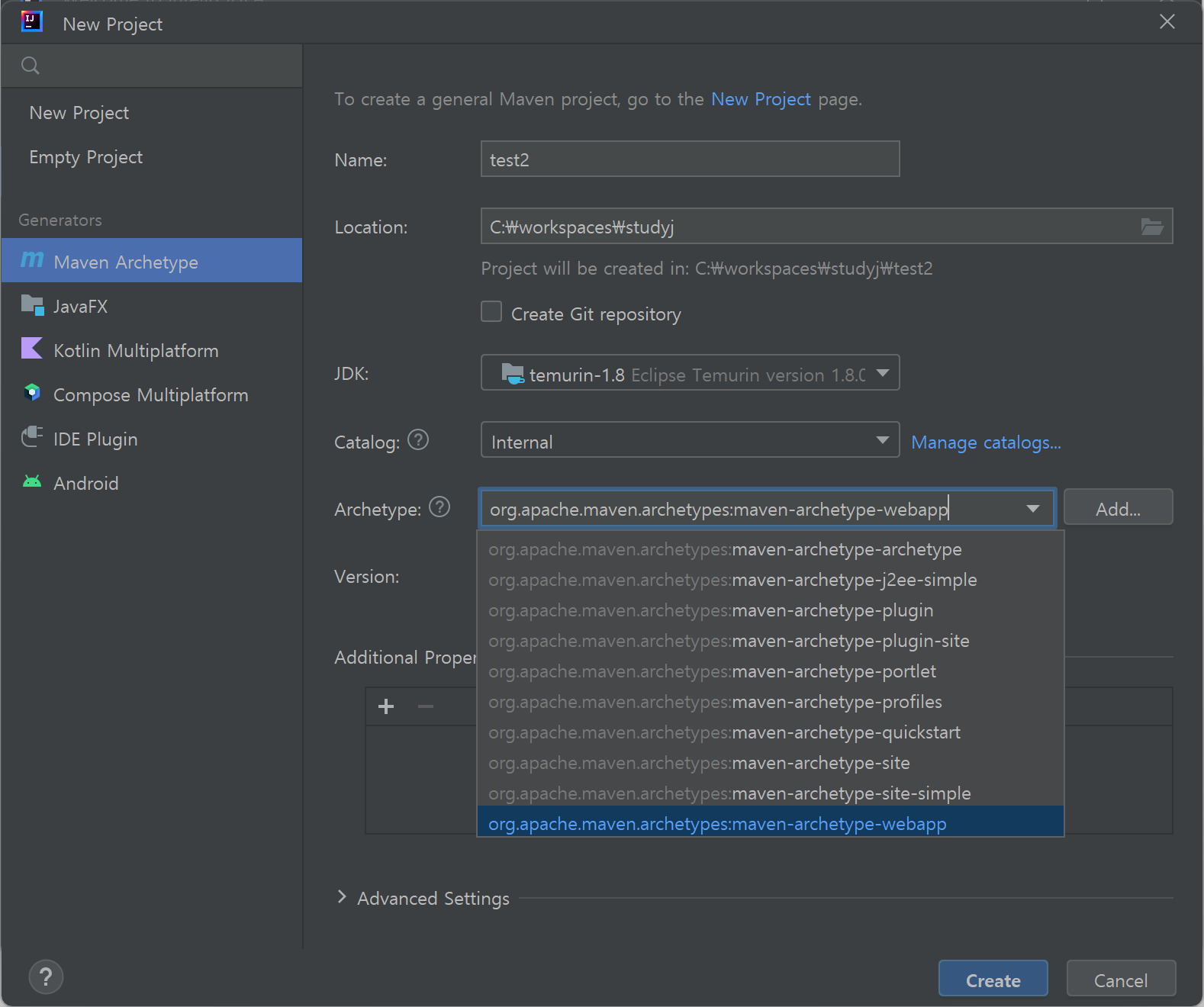 메이븐 아키타입(Archetype)은 "org.apache.maven.archetypes:maven-archetype-webapp"를 선택하였습니다.