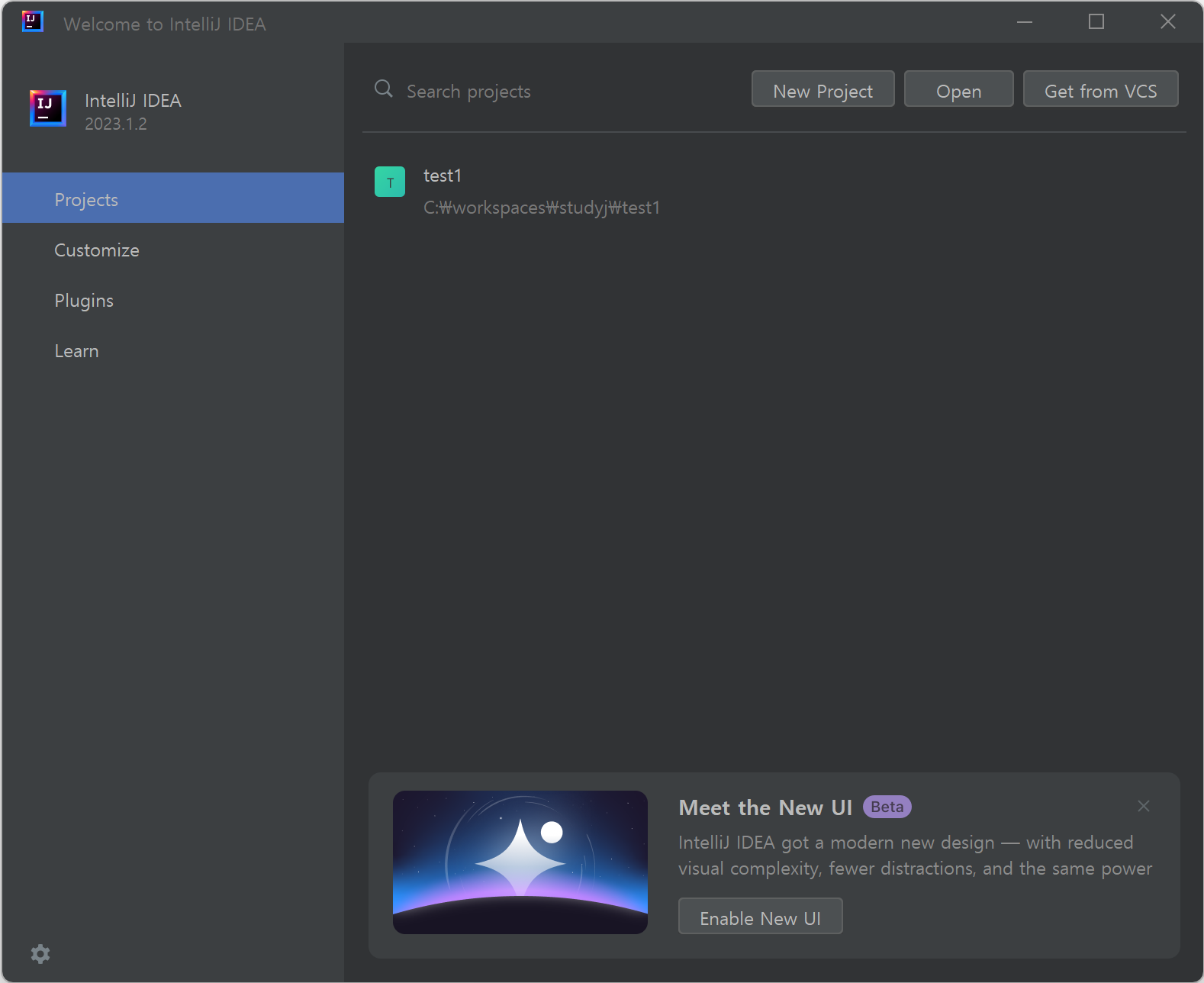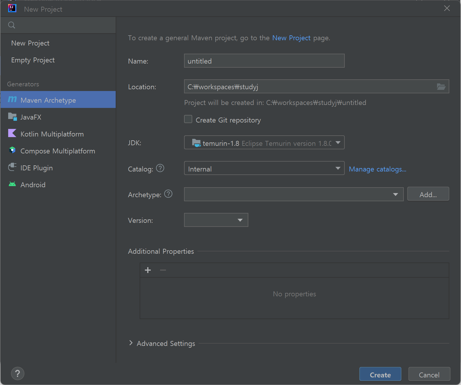 프로젝트 경로(Location)는 "C:\workspaces\studyj"로 하였습니다. (Git 연동은 다음에 하도록 하겠습니다.)