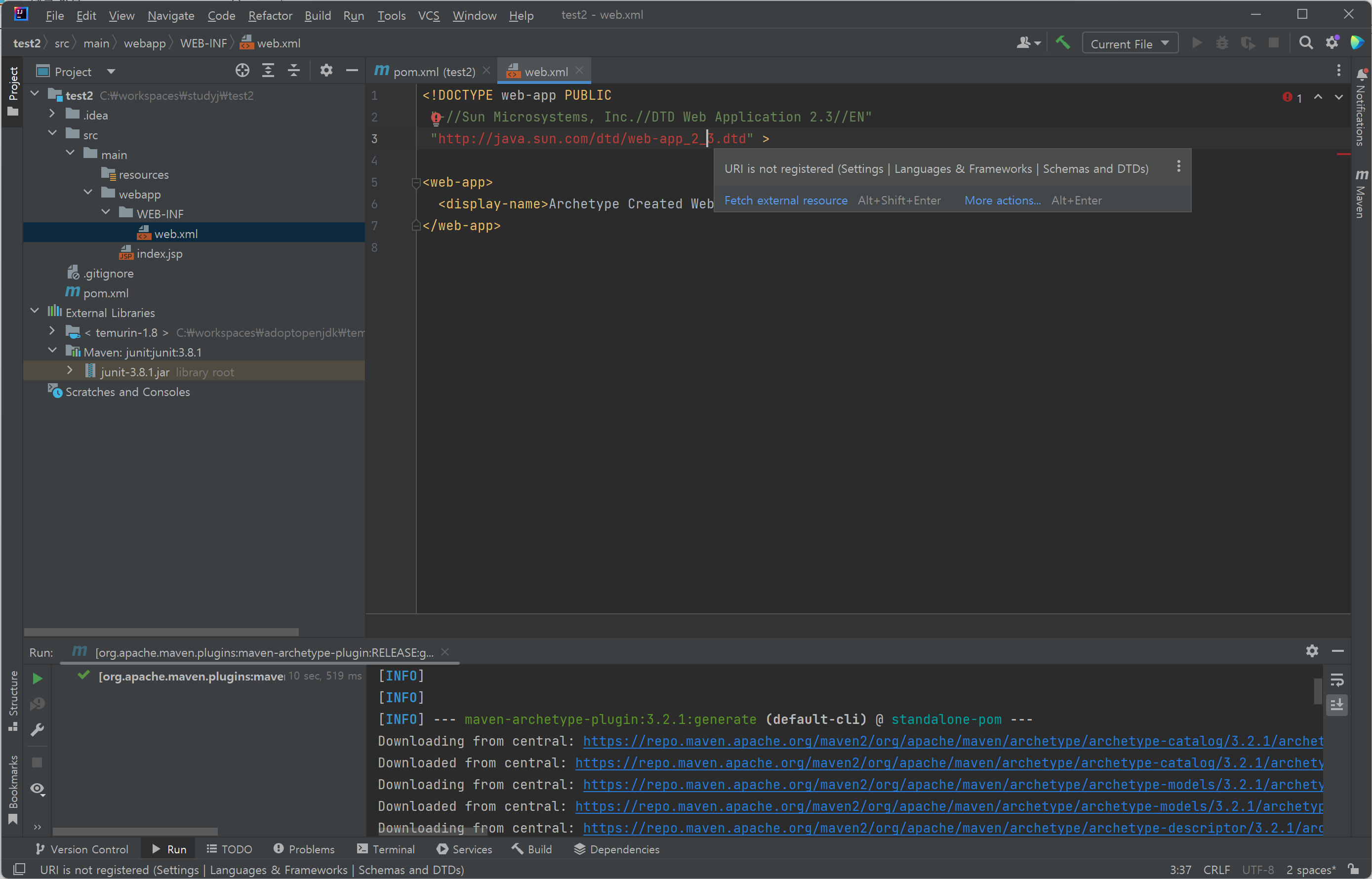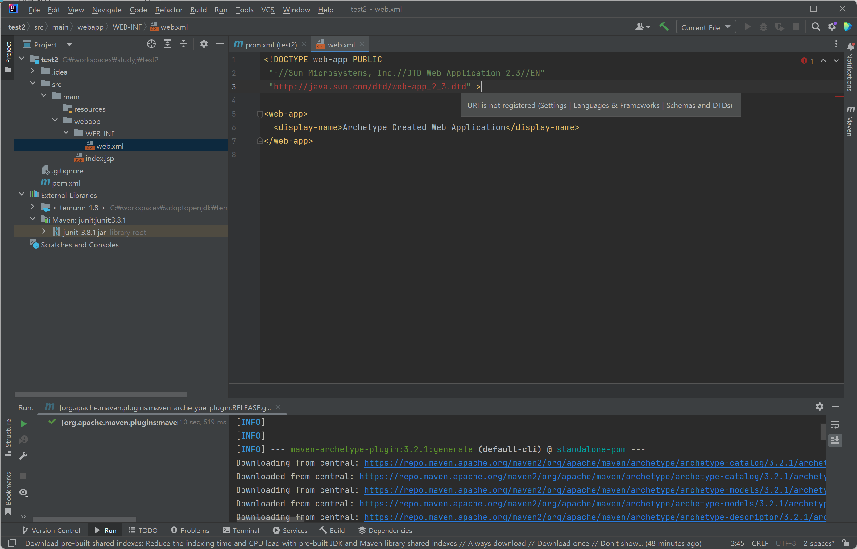 web.xml를 열어보면 "URI is not registered (Settings | Languages & Frameworks | Schemas and DTDs)" URI가 등록되어 있지 않다는 에러가 있습니다.