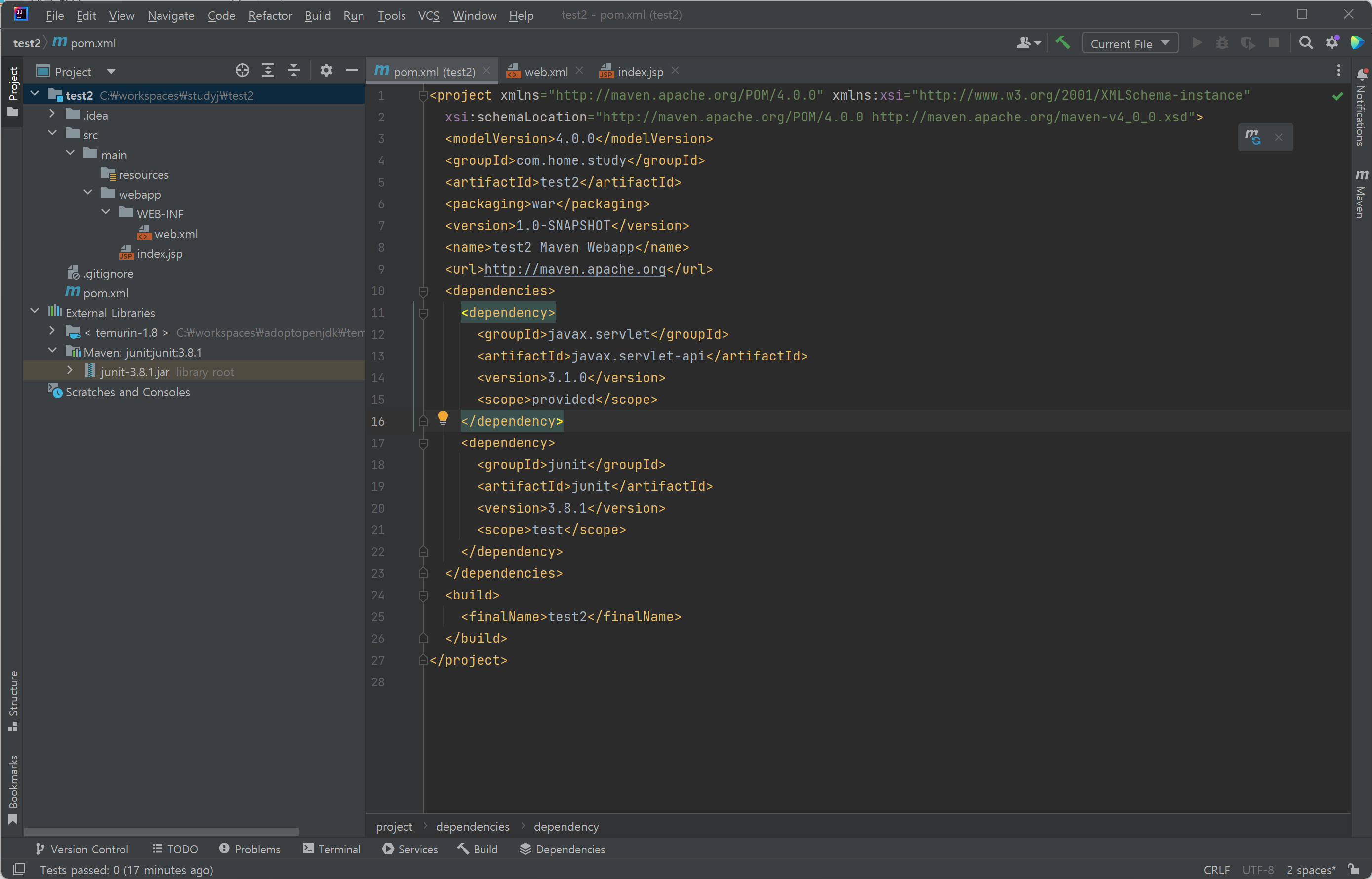 <dependencies>를 보면 "junit"이 기본적으로 추가되어 있습니다.