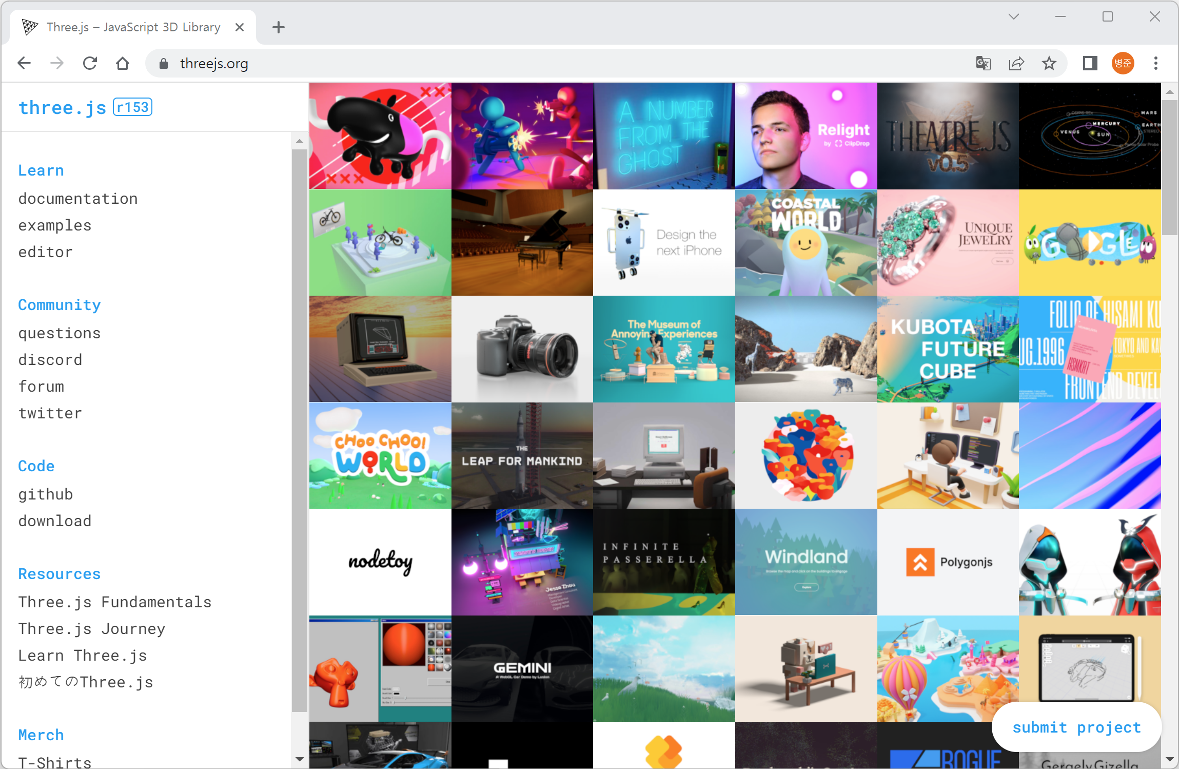 Three.js는 오픈 소스 프로젝트로 GitHub에 공개되어 있다. (https://github.com/mrdoob/three.js/)
