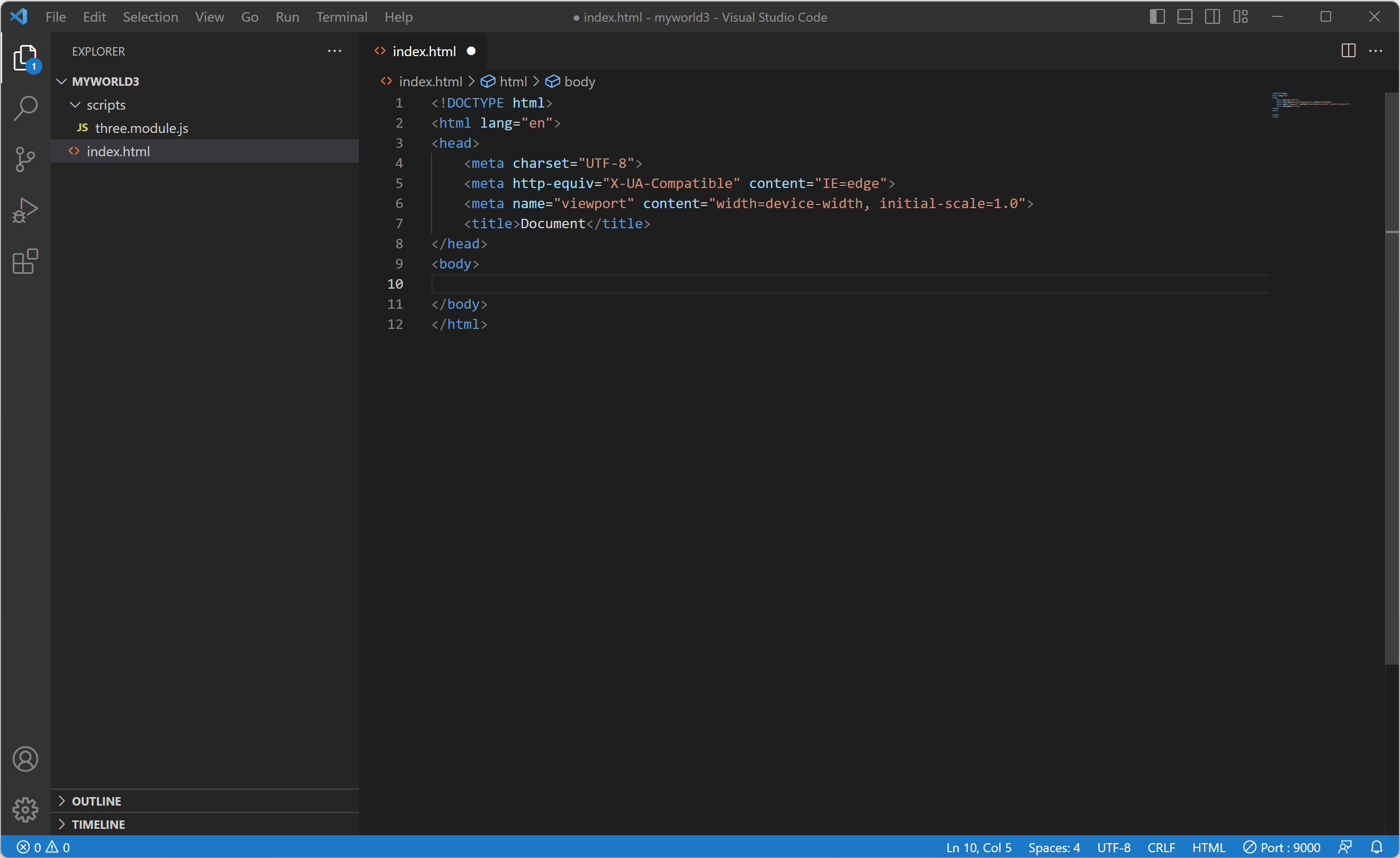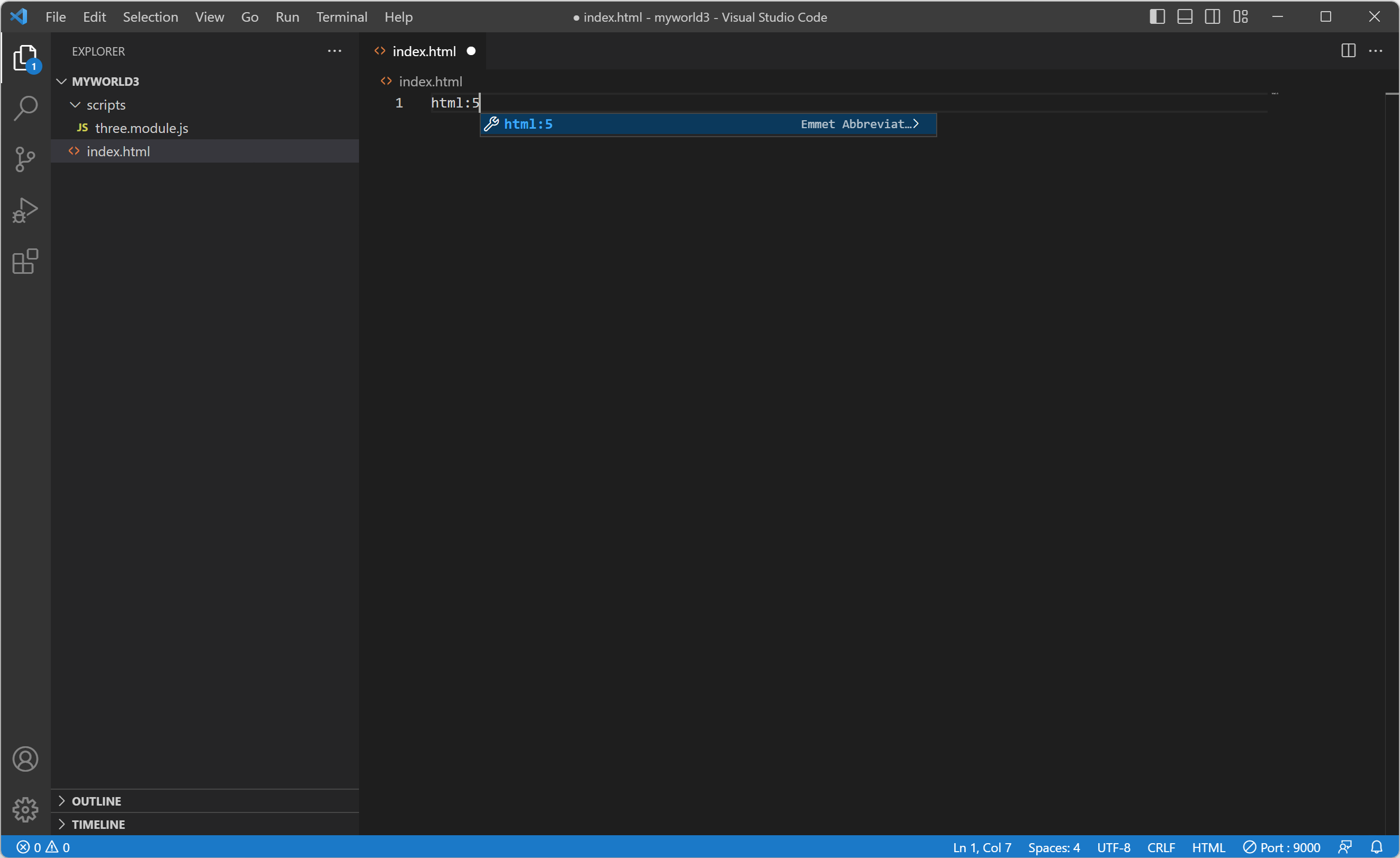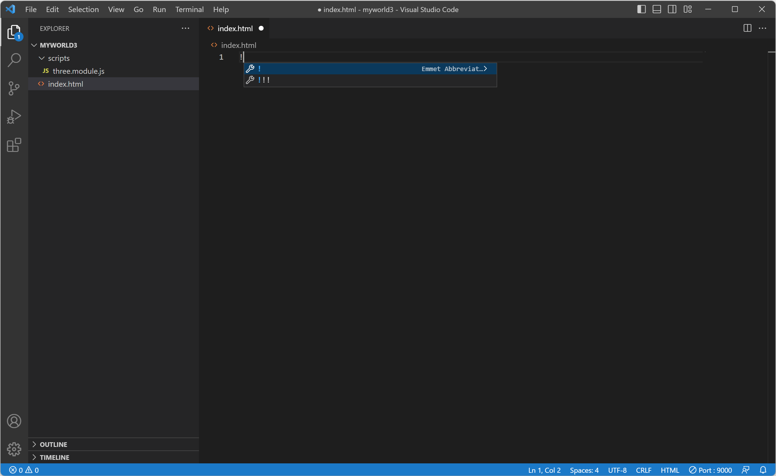 5. index.html 파일을 생성하기 위해서 EXPLORER(탐색기)의 MYWORLD3을 선택하고 첫 번째 아이콘(New File...(새 파일))을 클릭하고 입력란에 "index.html"를 입력하고 Enter 키를 눌러 파일을 생성합니다. 그리고 에디터에서 "!"를 입력하고 Enter 키를 누릅니다.