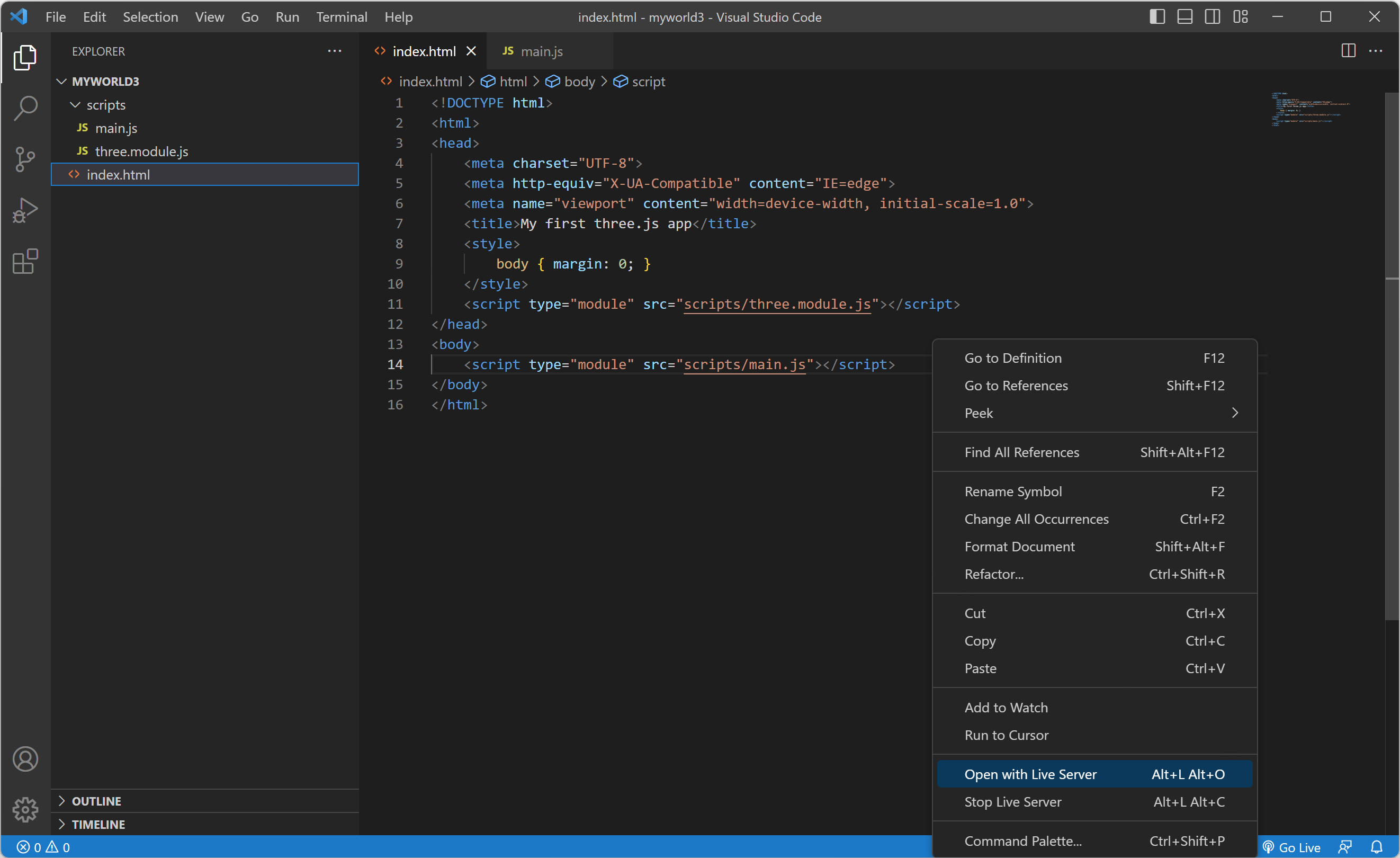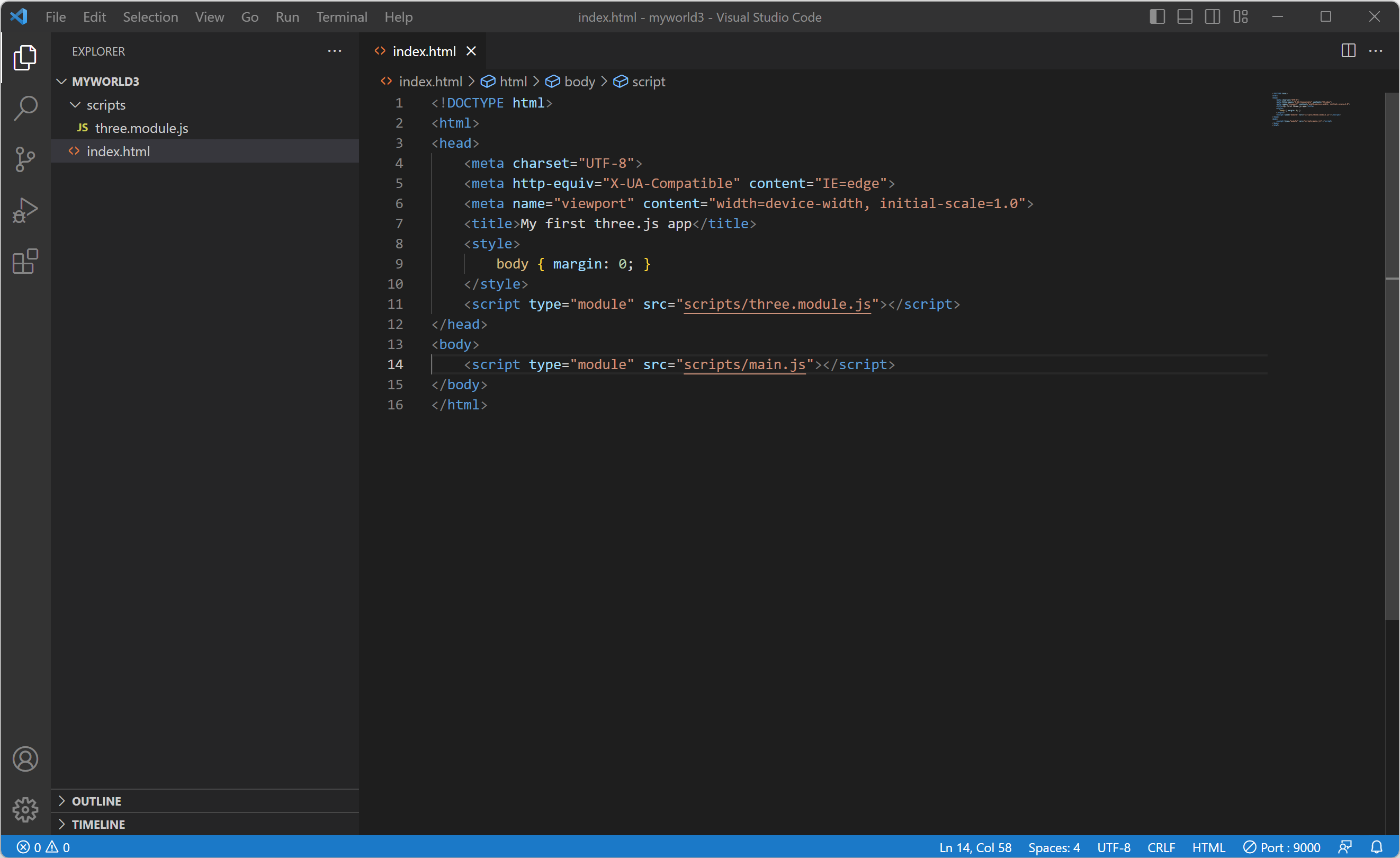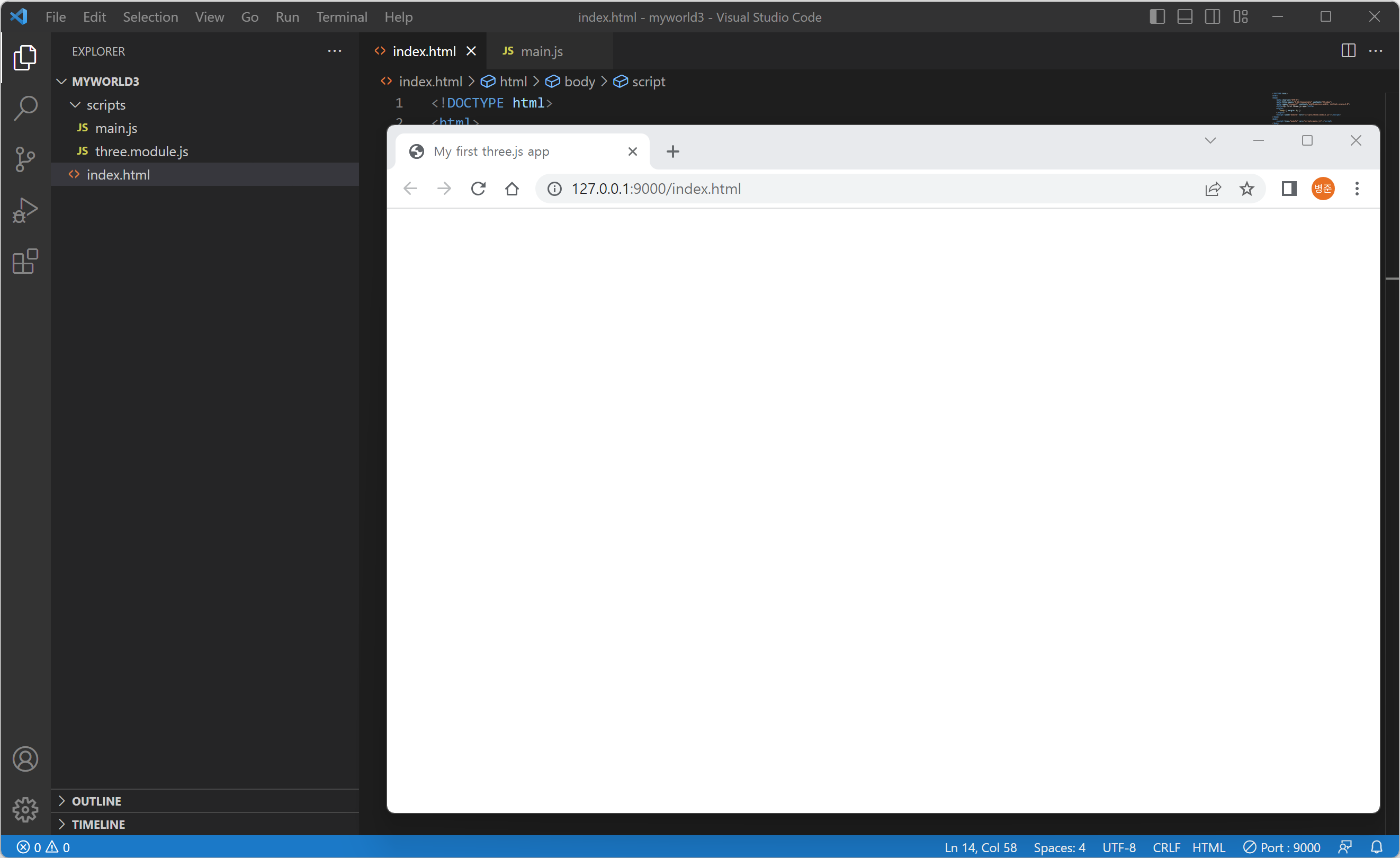 6. three.module.js 파일을 불러오기 위해서 스크립트의 module을 추가합니다.