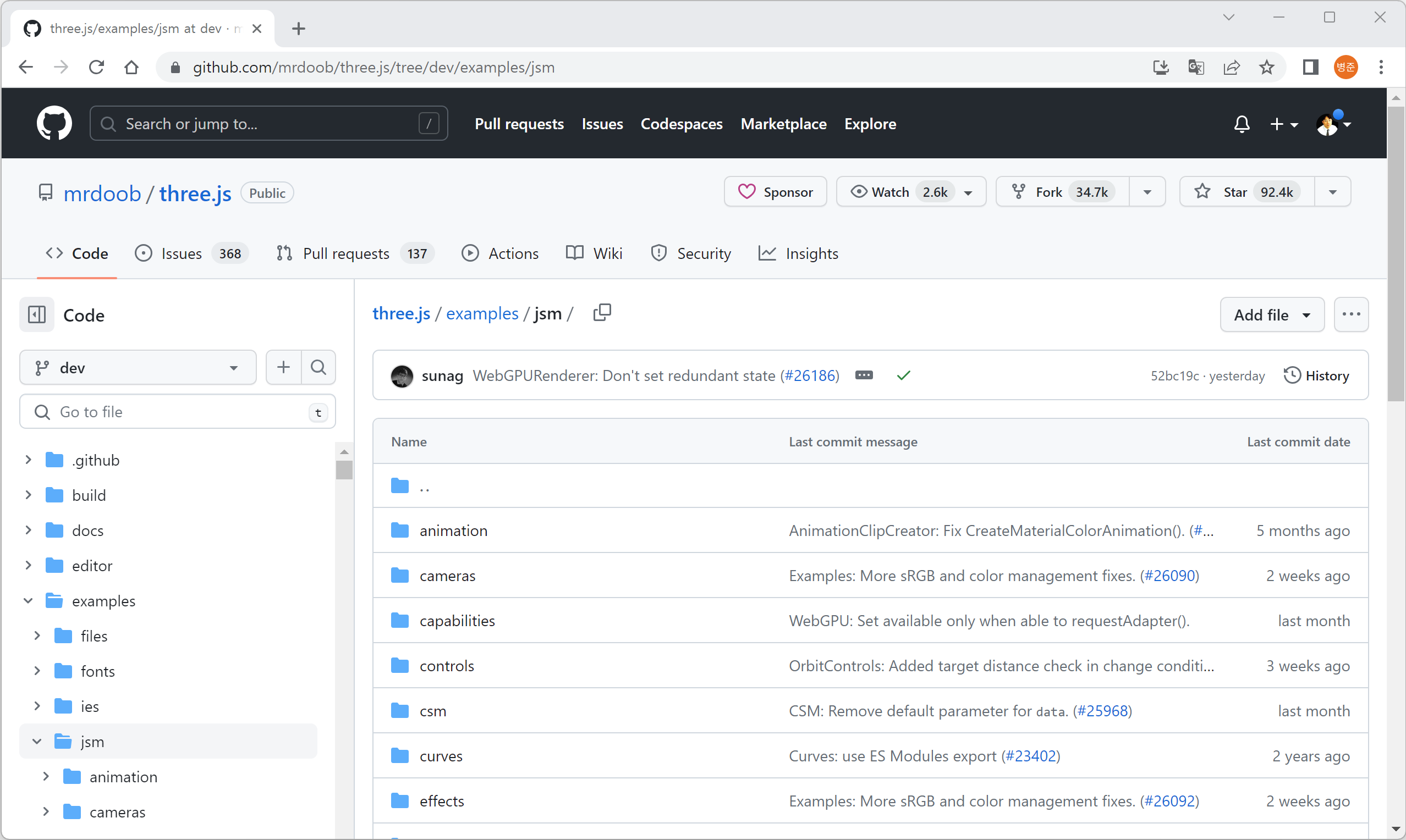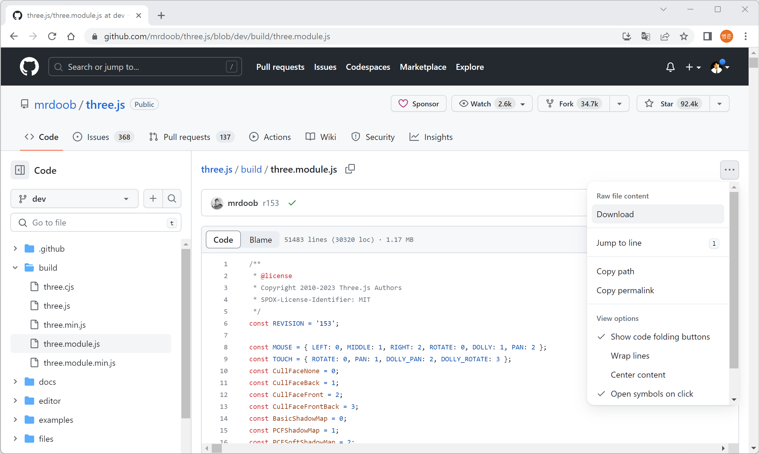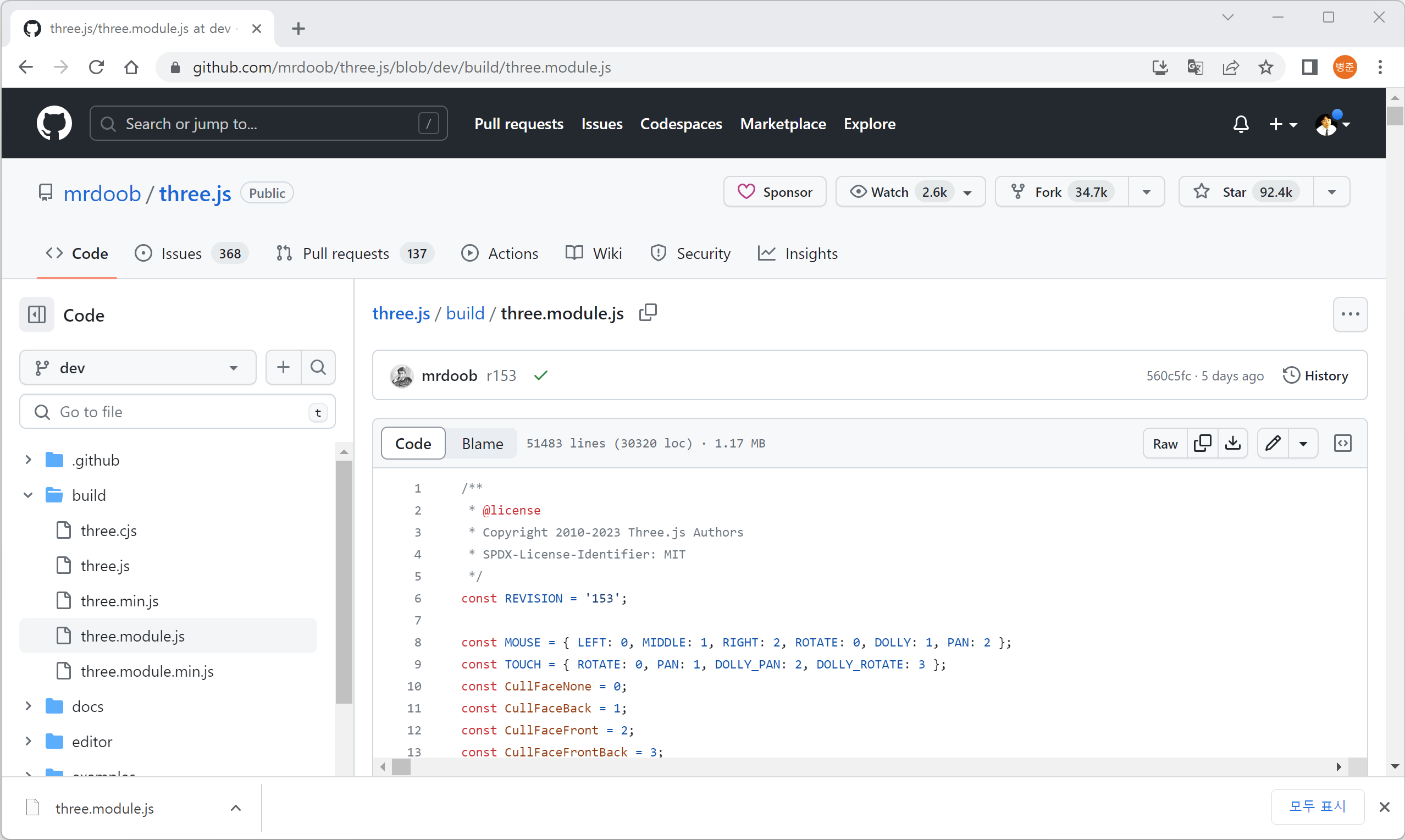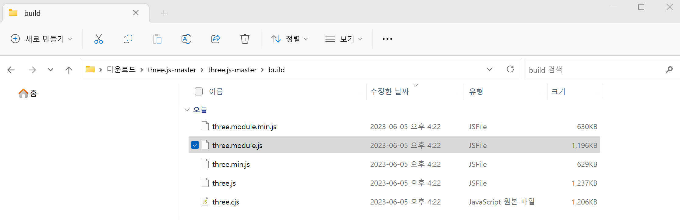 또는 GitHub에서 three.module.js 파일을 직접 받을 수 있습니다.