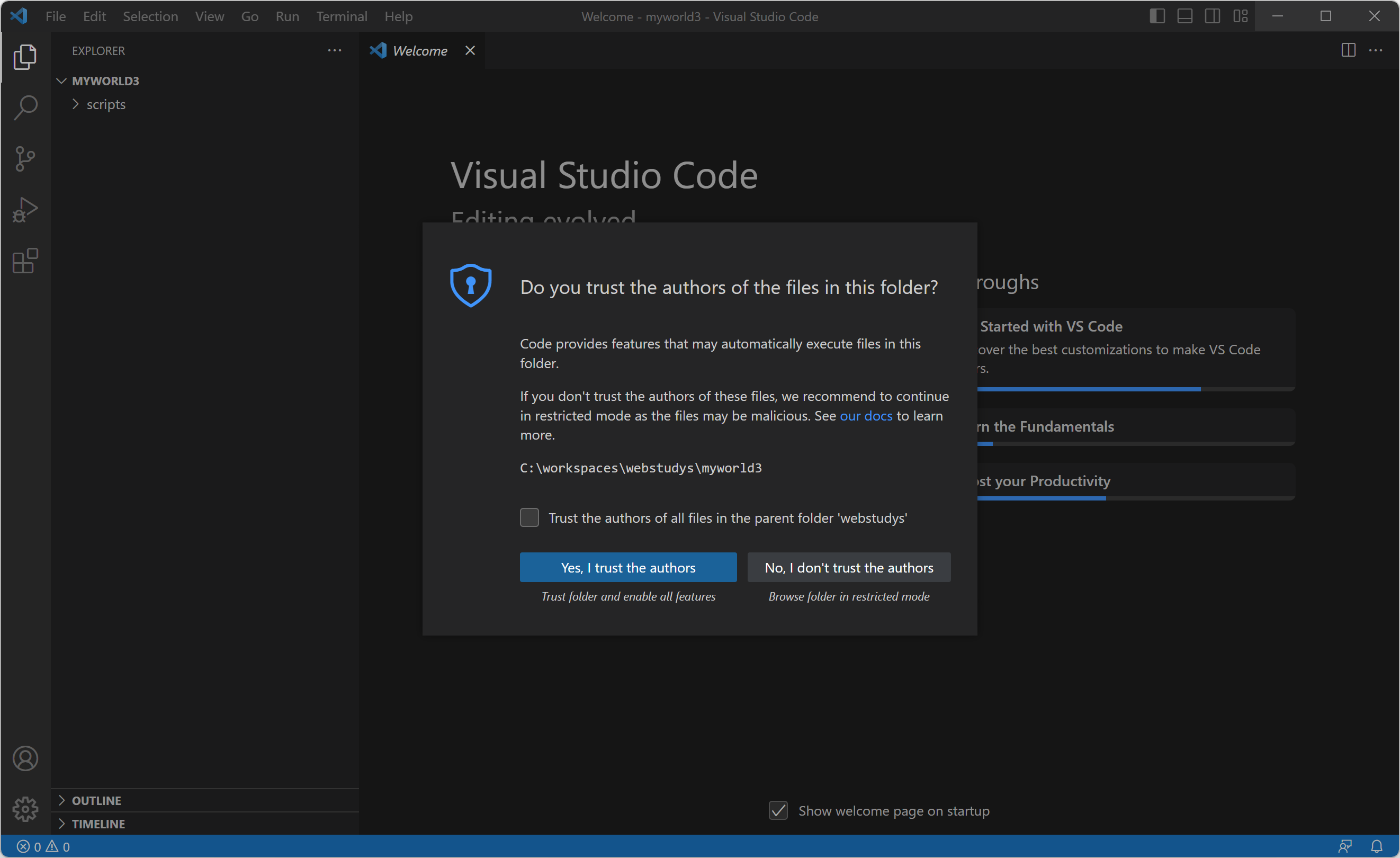 4. Visual Studio Code의 메뉴 File(파일) > Open Folder...(폴더 열기)를 클릭하거나 Ctrl 키를 누를 상태에서 K, O를 이어서 누릅니다. (Ctrl + K, Ctrl + O) 그리고 "C:\workspaces\webstudys\myworld3" 폴더로 이동하고 "폴더 선택" 버튼을 누르면 폴더가 오픈됩니다.