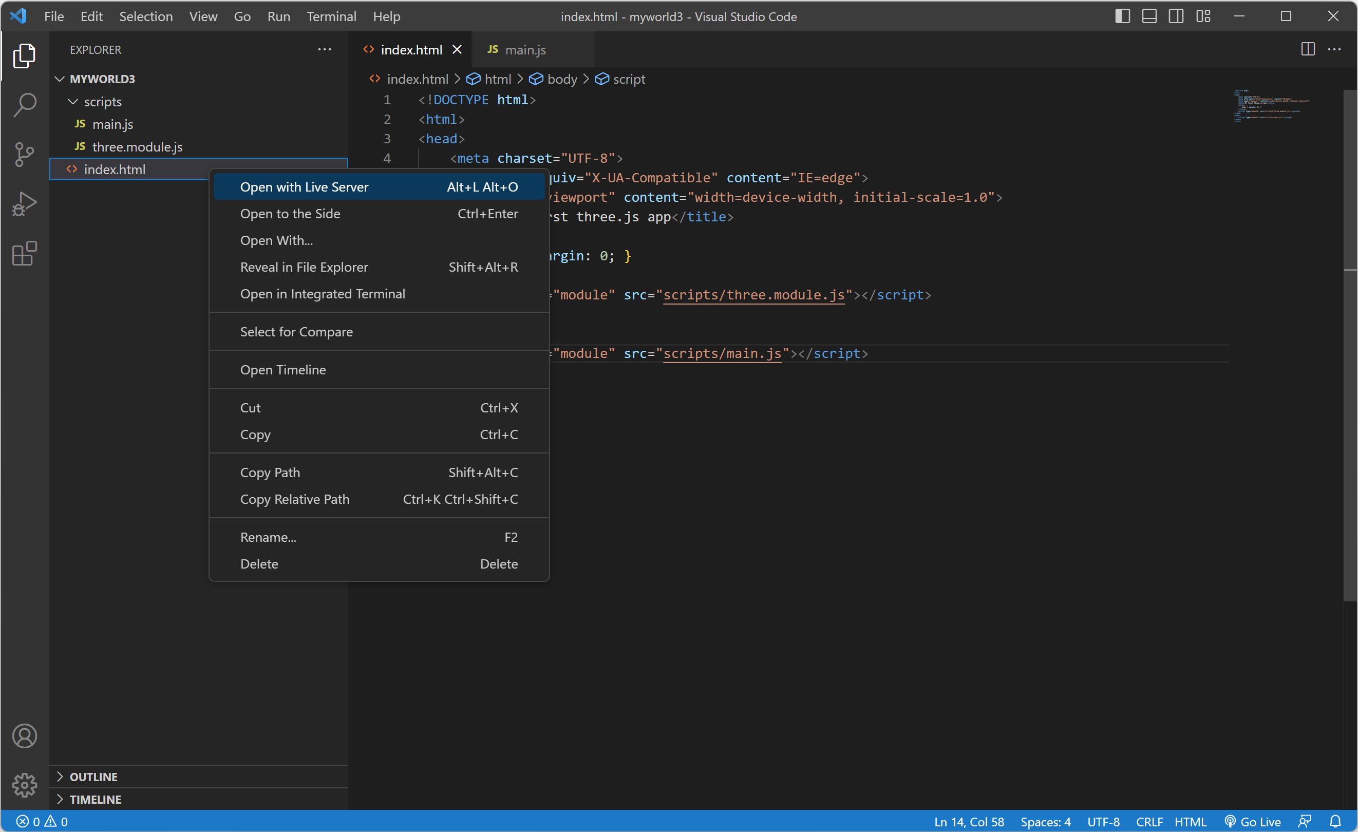 1. index.html 파일에서 마우스 오른쪽 버튼을 눌러 콘텍스트 메뉴에서 "Open with Live Server"를 클릭합니다.
