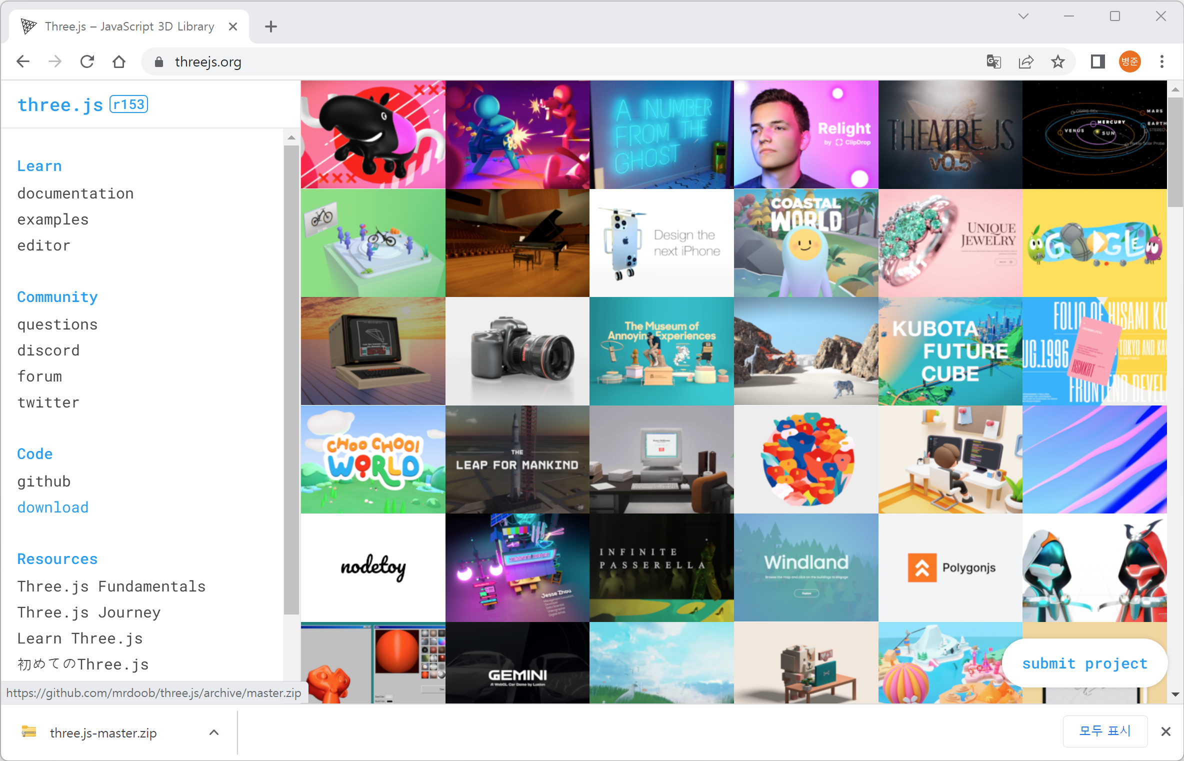 1. Three.js 사이트(https://threejs.org/)에서 왼쪽 메뉴에 있는 download를 클릭하여 three.js-master.zip 파일을 다운로드합니다.