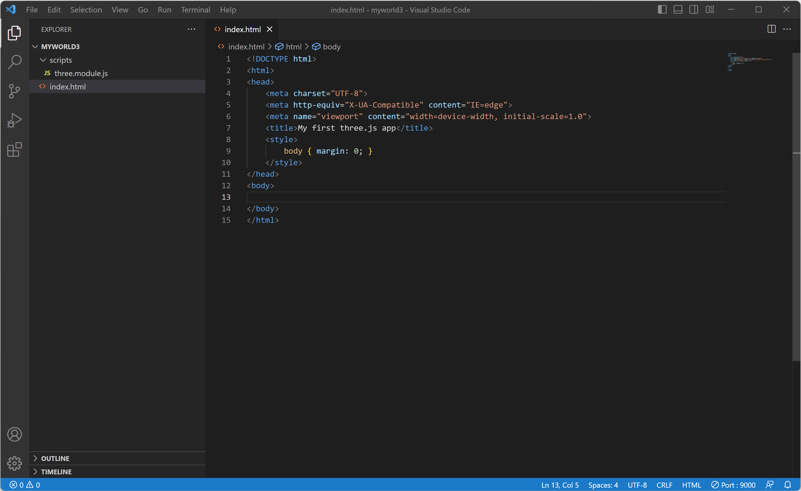 에디터에서 <html> 태그에 있는 "lang" 속성은 제거합니다. 그리고 <title> 태그에 있는 "Document"를 제거하고 "My first three.js app"로 입력합니다. 그리고 <style> 태그를 추가합니다.