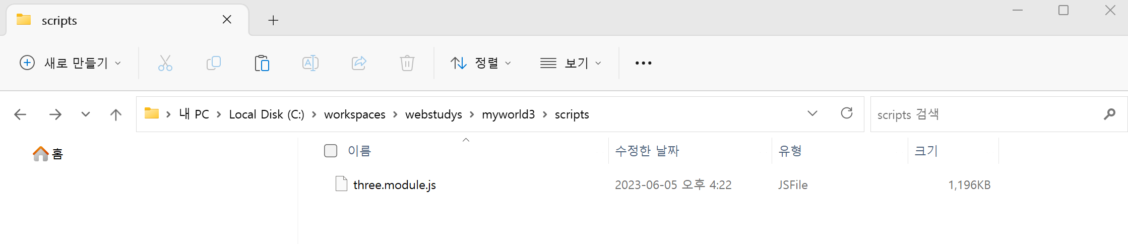 2. Three.js를 Script으로 불러와 개발하기 위해 폴더를 생성합니다. 저는 "C:\workspaces\webstudys\myworld3" 폴더를 생성하였습니다. 생성된 프로젝트 폴더에 scripts 폴더를 생성합니다.