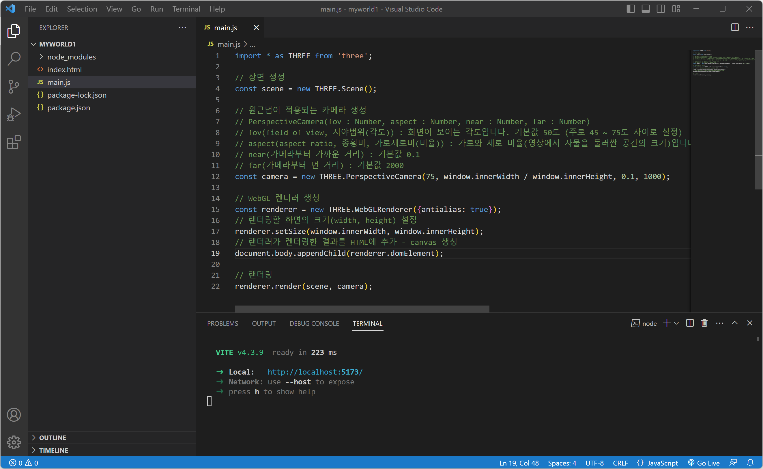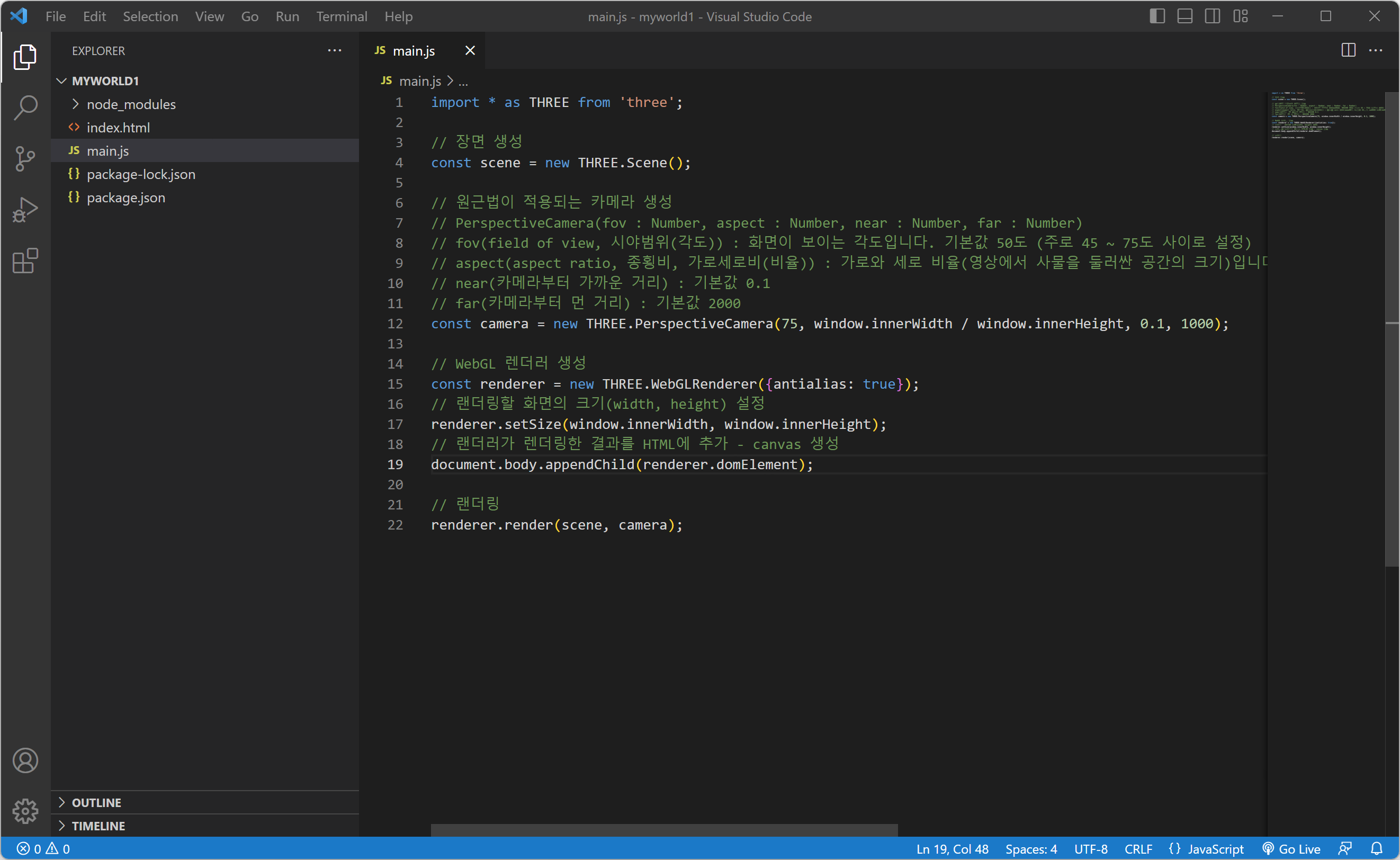 main.js에서 canvas 객체를 가져와 WebGLRenderer(렌더러) 파라미터에 추가합니다.