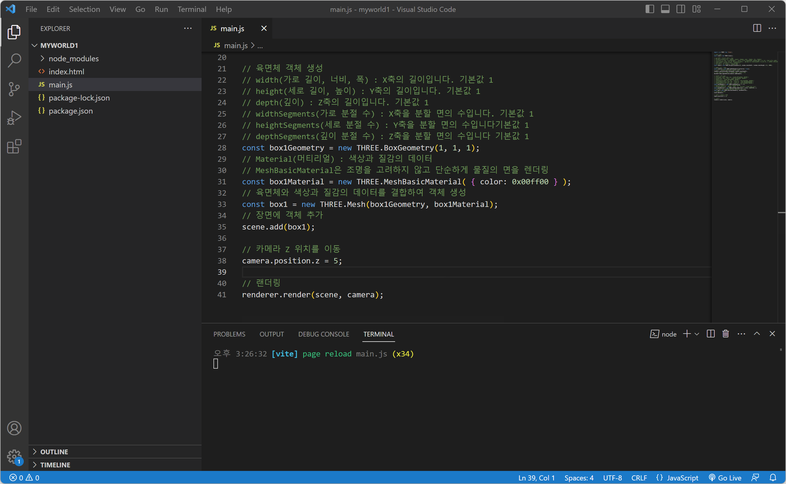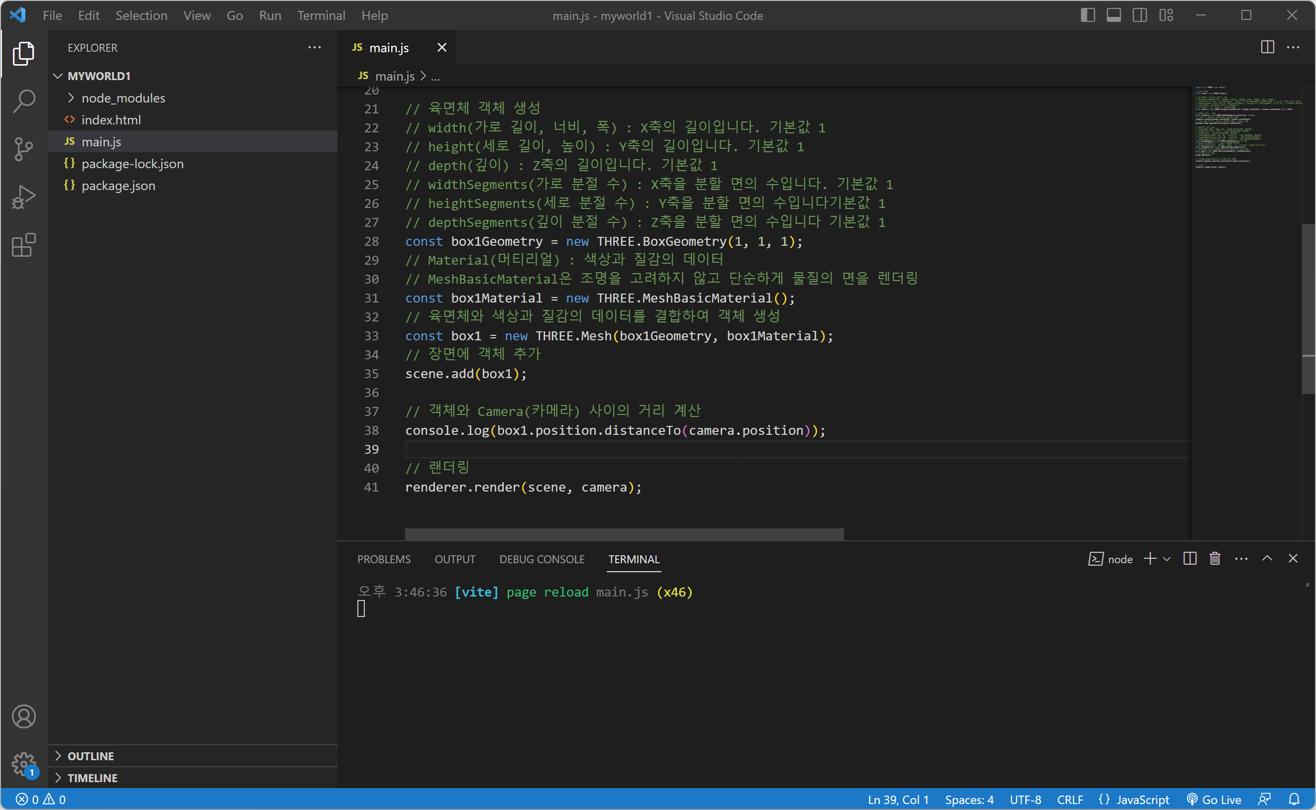 그럼 three.js로 3차원을 표현(Rendering, 렌더링) 하도록 하겠습니다.