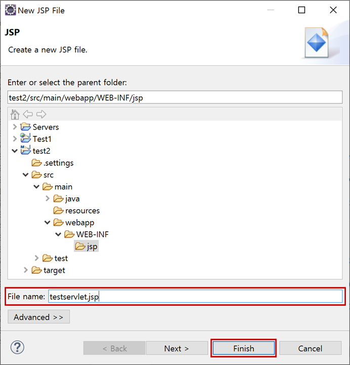 5. "test2" 프로젝트의 "src > main > webapp > WEB-INF > jsp"에 "testservlet.jsp" 파일이 생성됩니다.