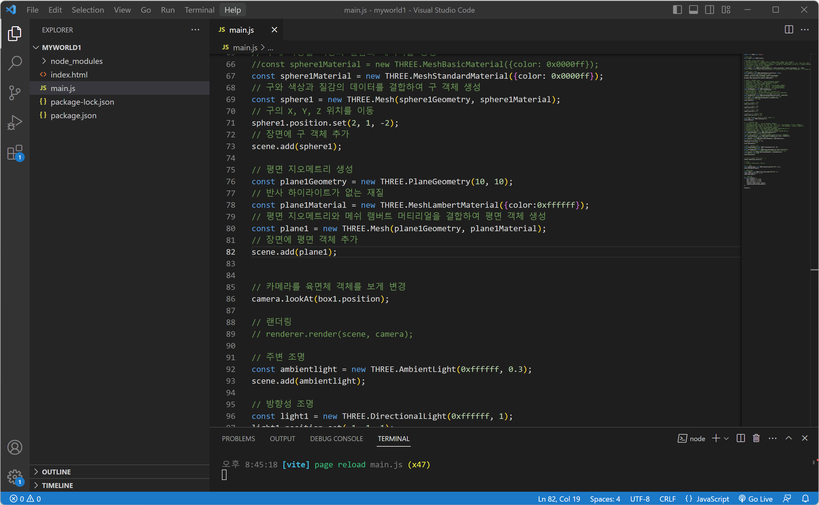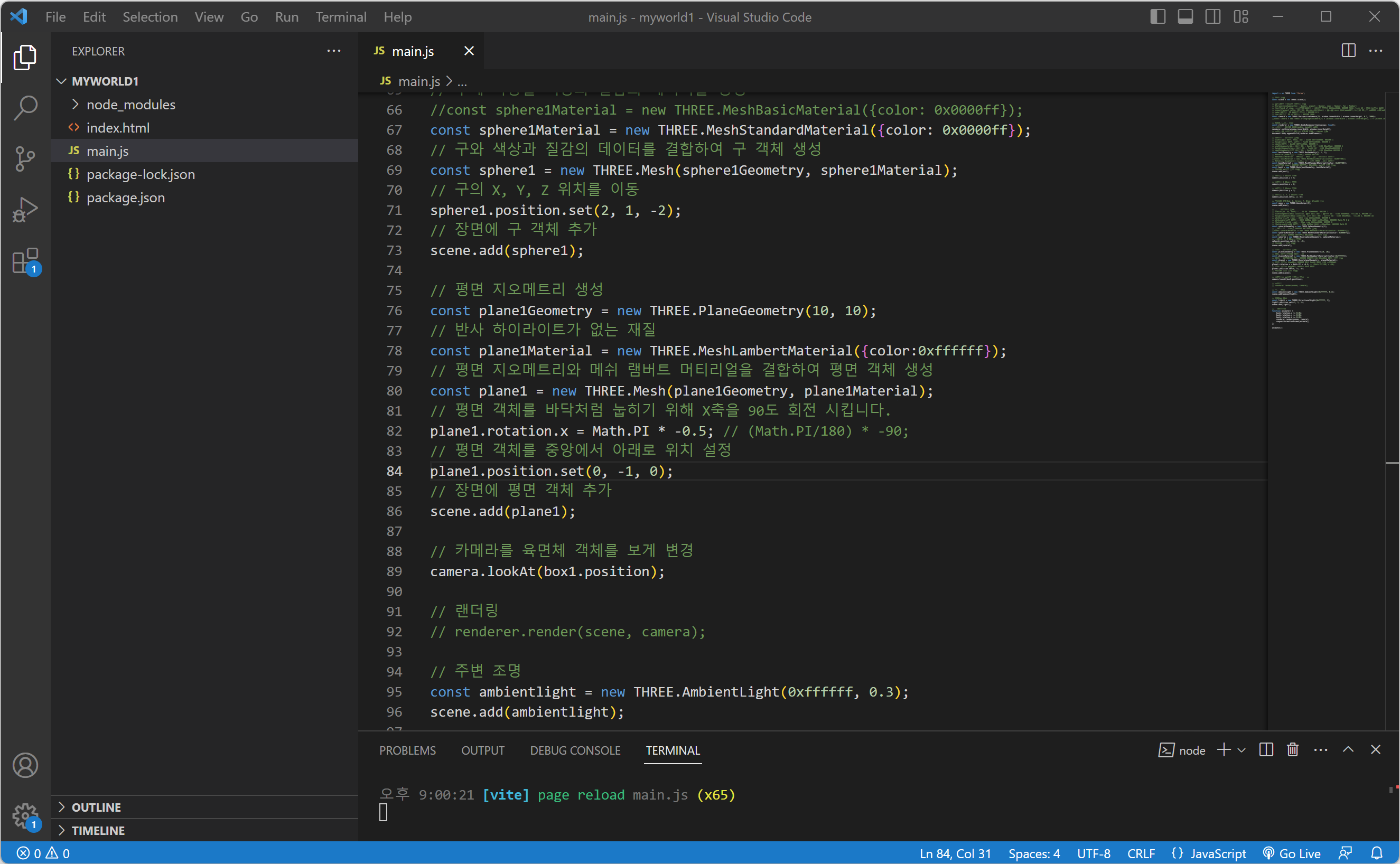Scence(씬, 장면)에 추가할 바닥으로 PlaneGeometry(플레인 지오메트리, 평면)을 생성합니다.