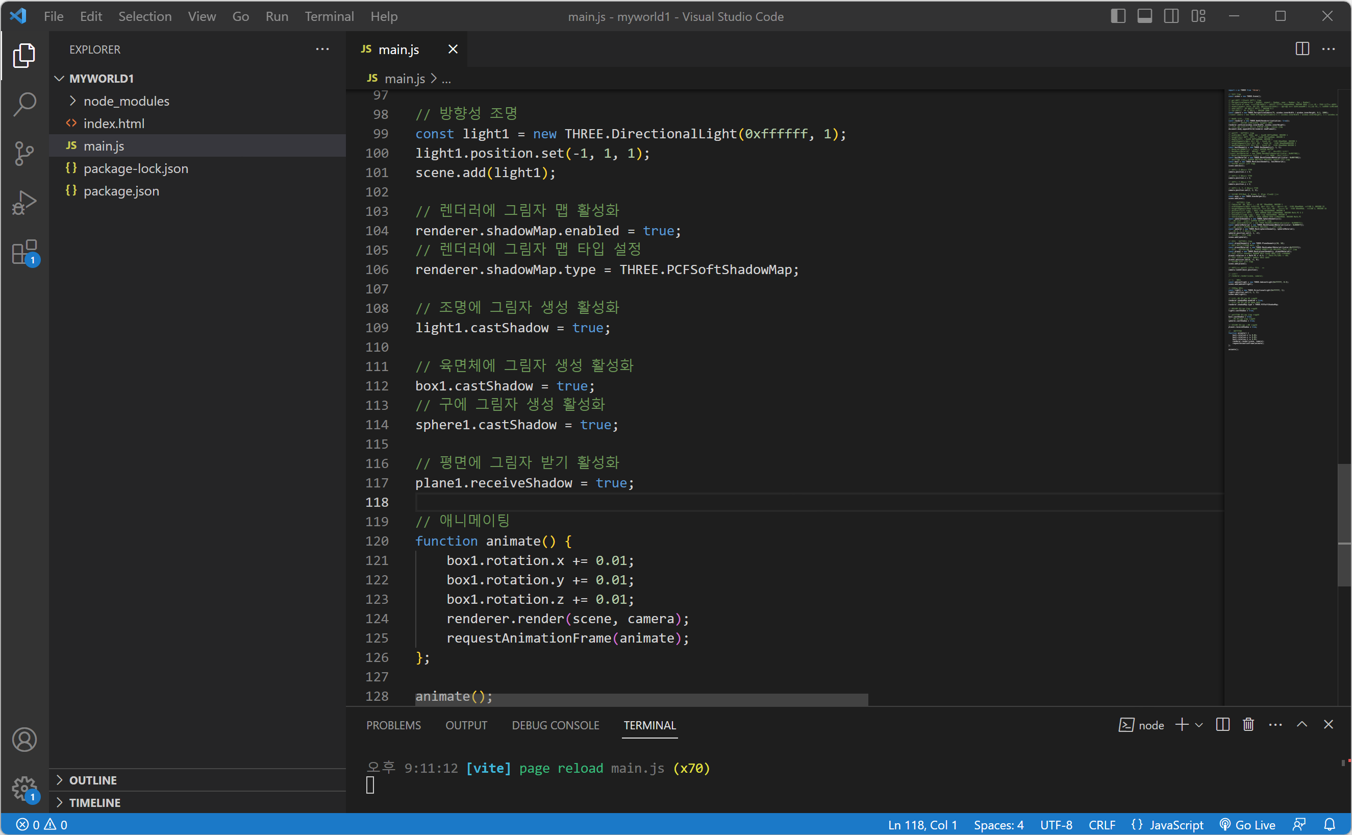 그림자를 만들기 위해서는 렌더러(Renderer)와 조명, 생선 된 객체에 그림자 생성 기능이 활성화되어야 합니다. 그리고 그림자가 표현될 객체에 그림자 받기 기능이 활성화되어야 합니다.