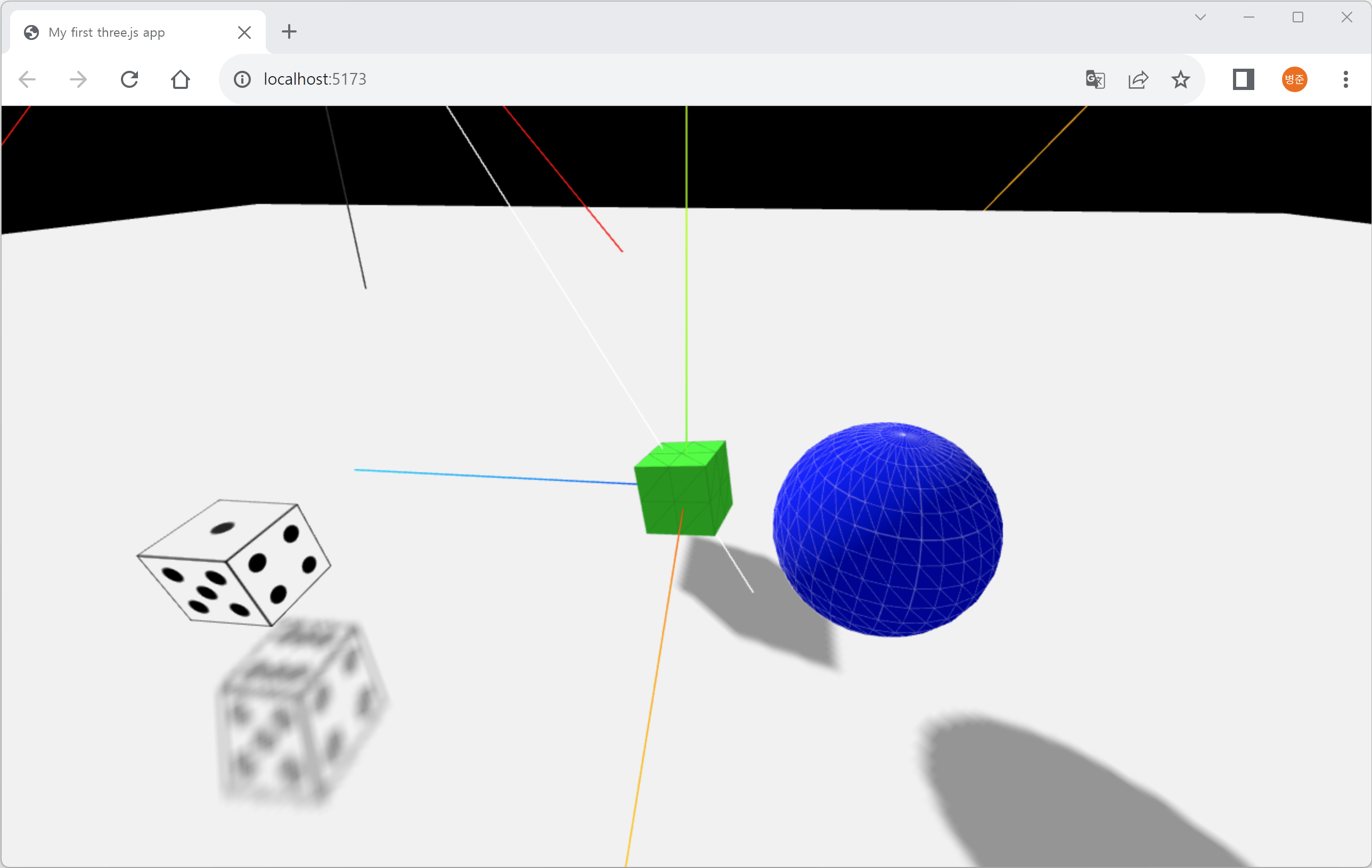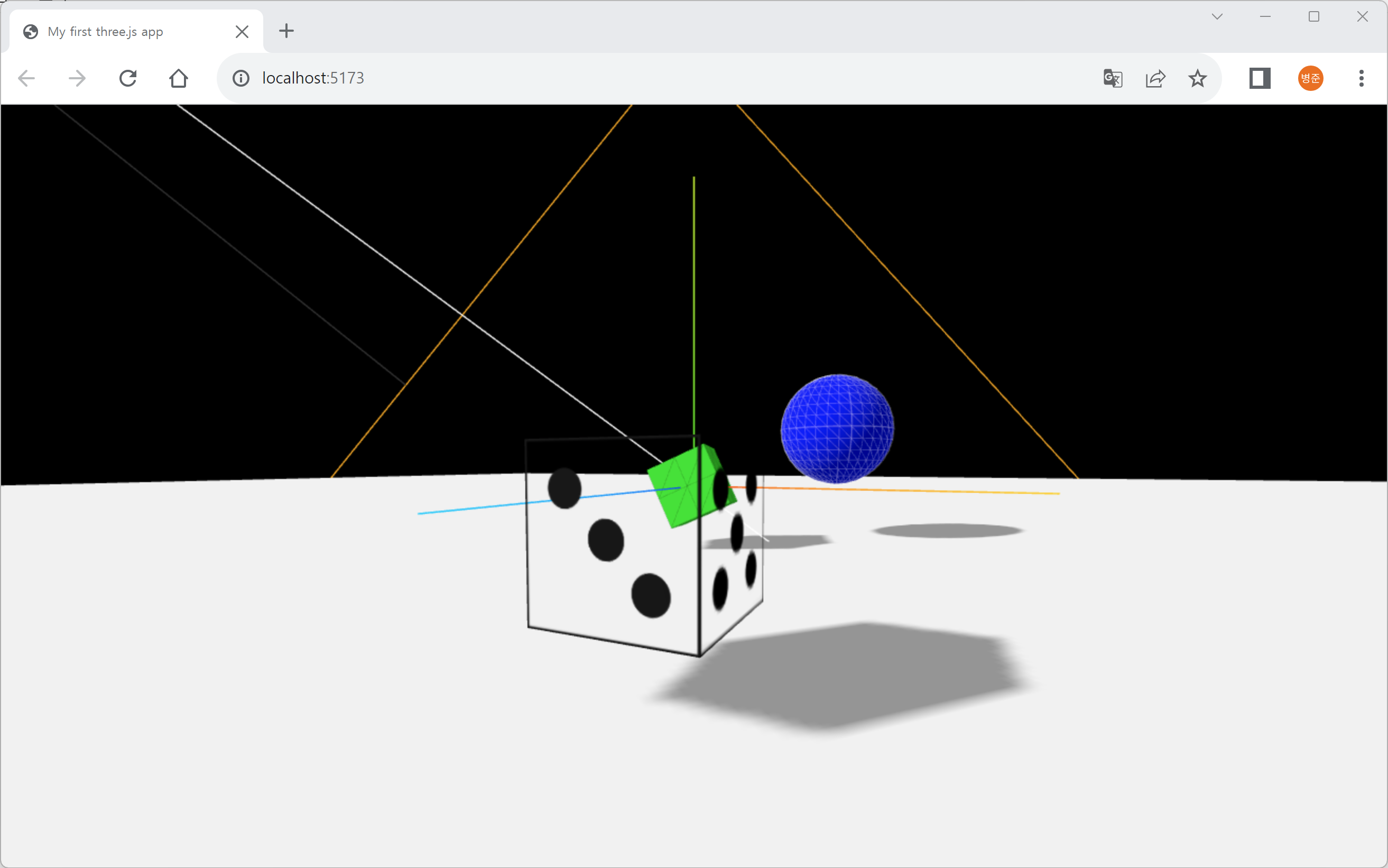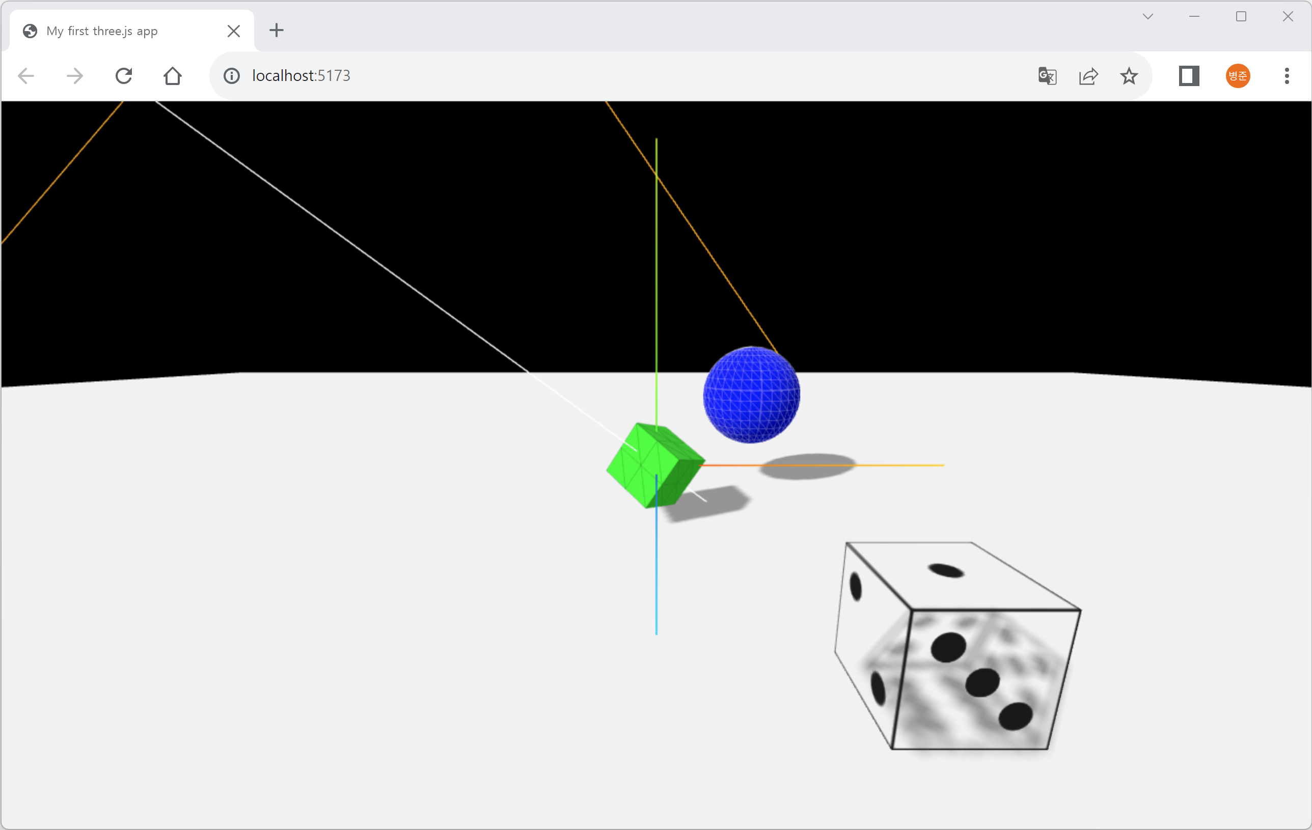그렇기 때문에 뒷면(THREE.BackSide)이 없는 주사위의 1번(위), 2번(왼쪽), 3번(앞쪽)은 그림자로 투과되지 않았습니다. 그리고 주사위의 4번(뒤), 5번(오른쪽), 6번(바닥)도 뒷면(THREE.BackSide)이 없어 주사위안에서 보이지 않았던 겁니다.