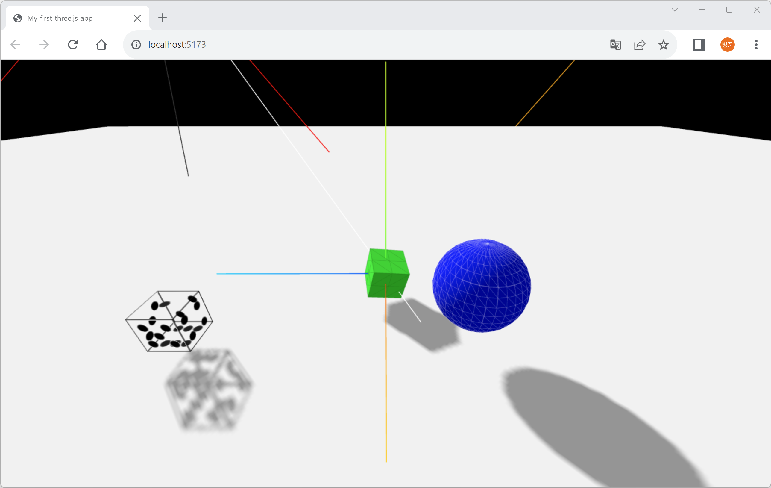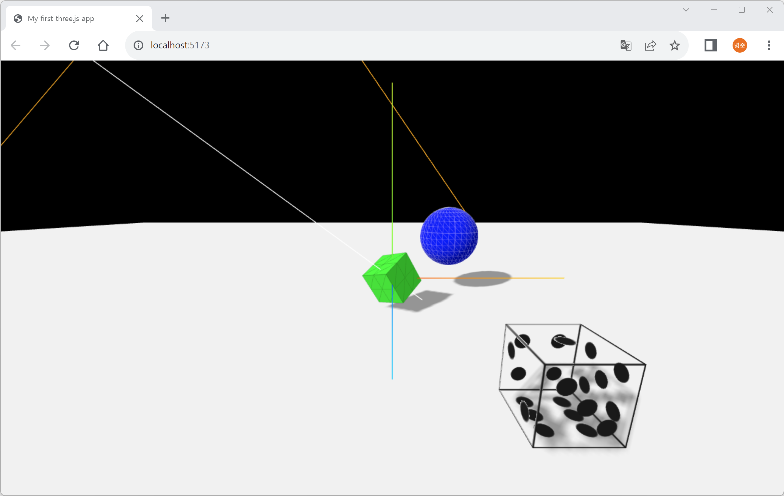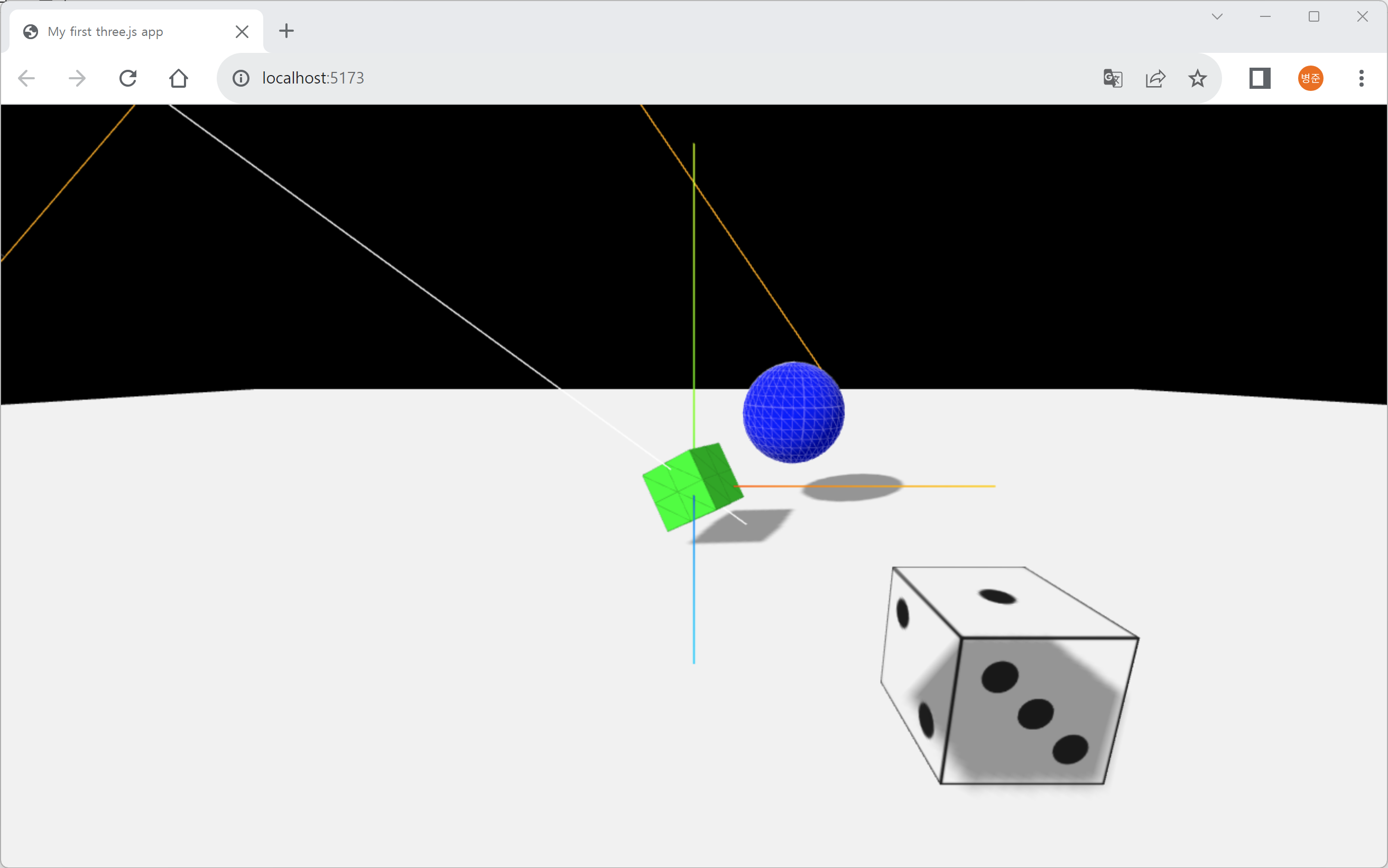 그렇기 때문에 뒷면(THREE.BackSide)이 없는 주사위의 1번(위), 2번(왼쪽), 3번(앞쪽)은 그림자로 투과되지 않았습니다. 그리고 주사위의 4번(뒤), 5번(오른쪽), 6번(바닥)도 뒷면(THREE.BackSide)이 없어 주사위안에서 보이지 않았던 겁니다.