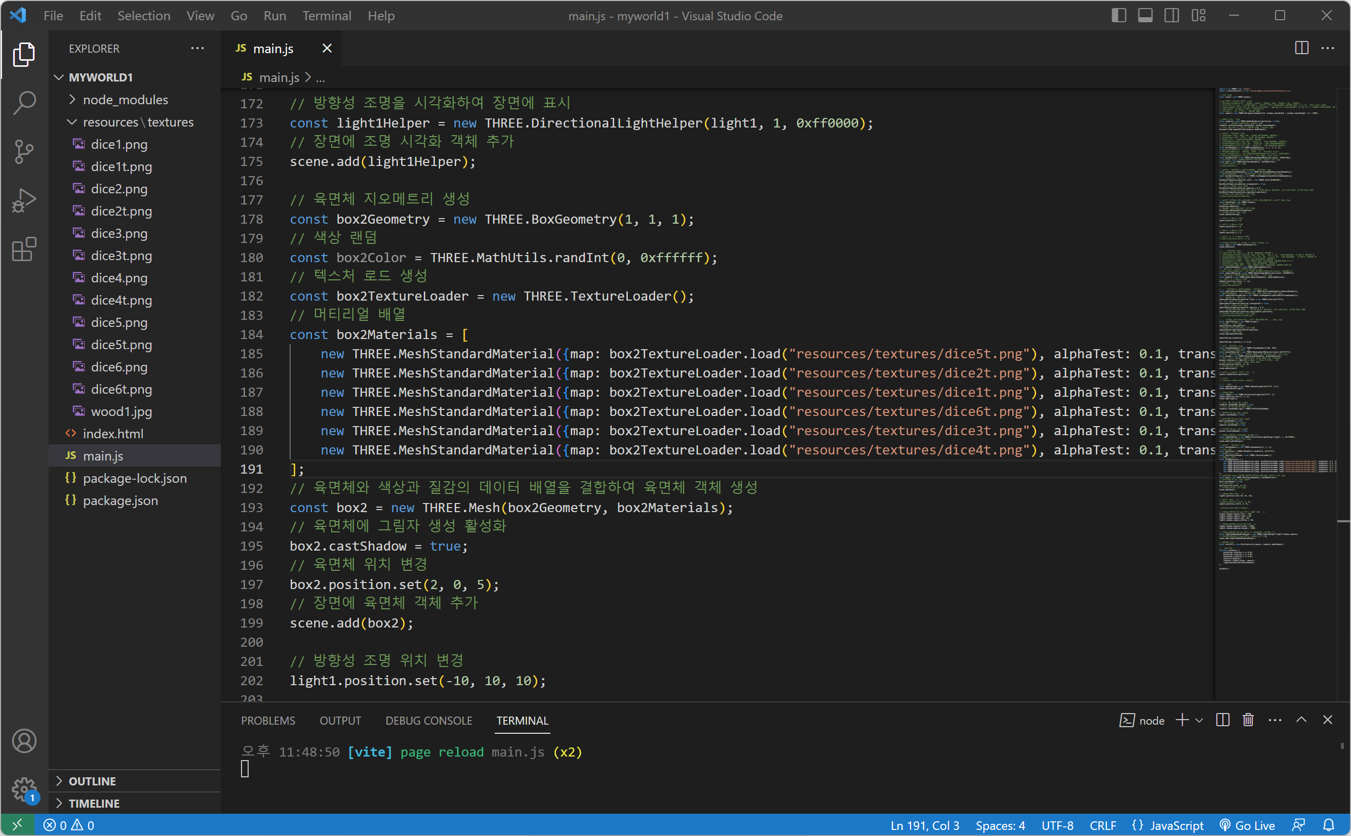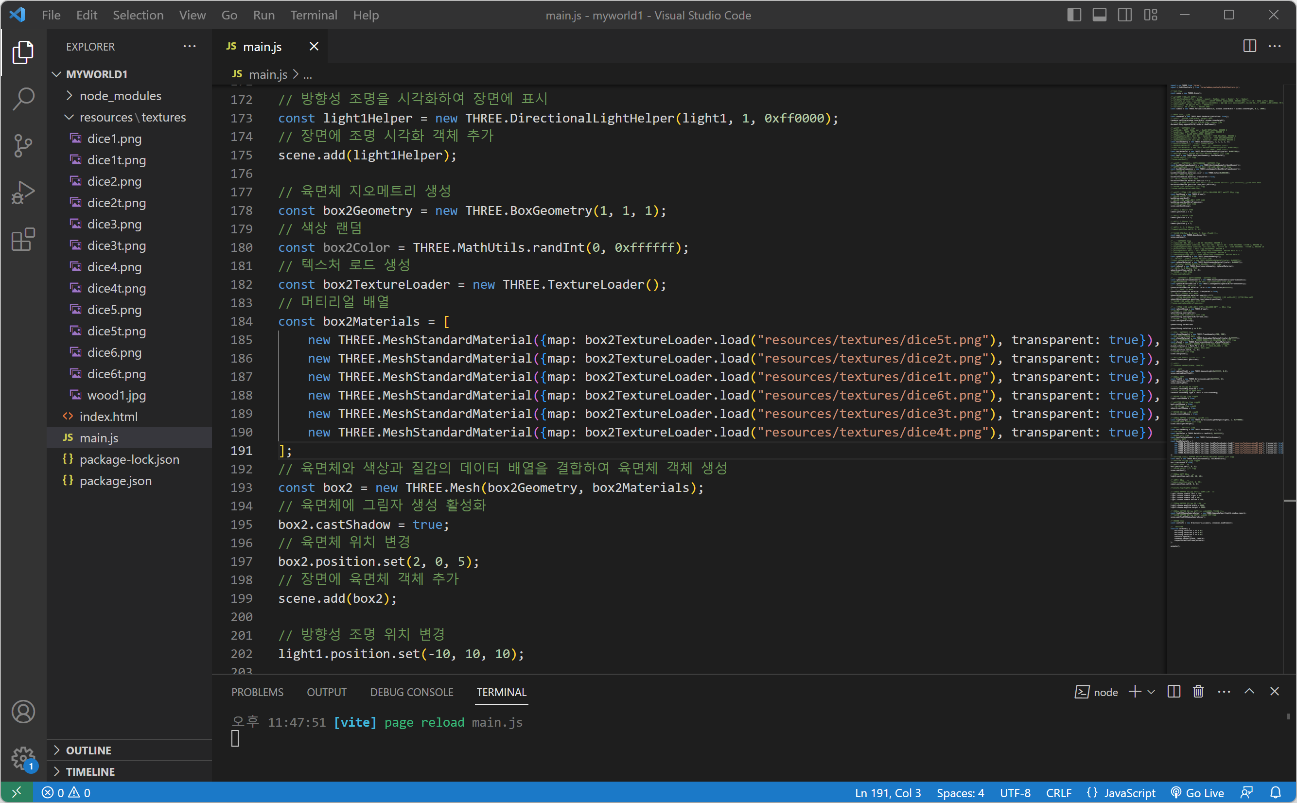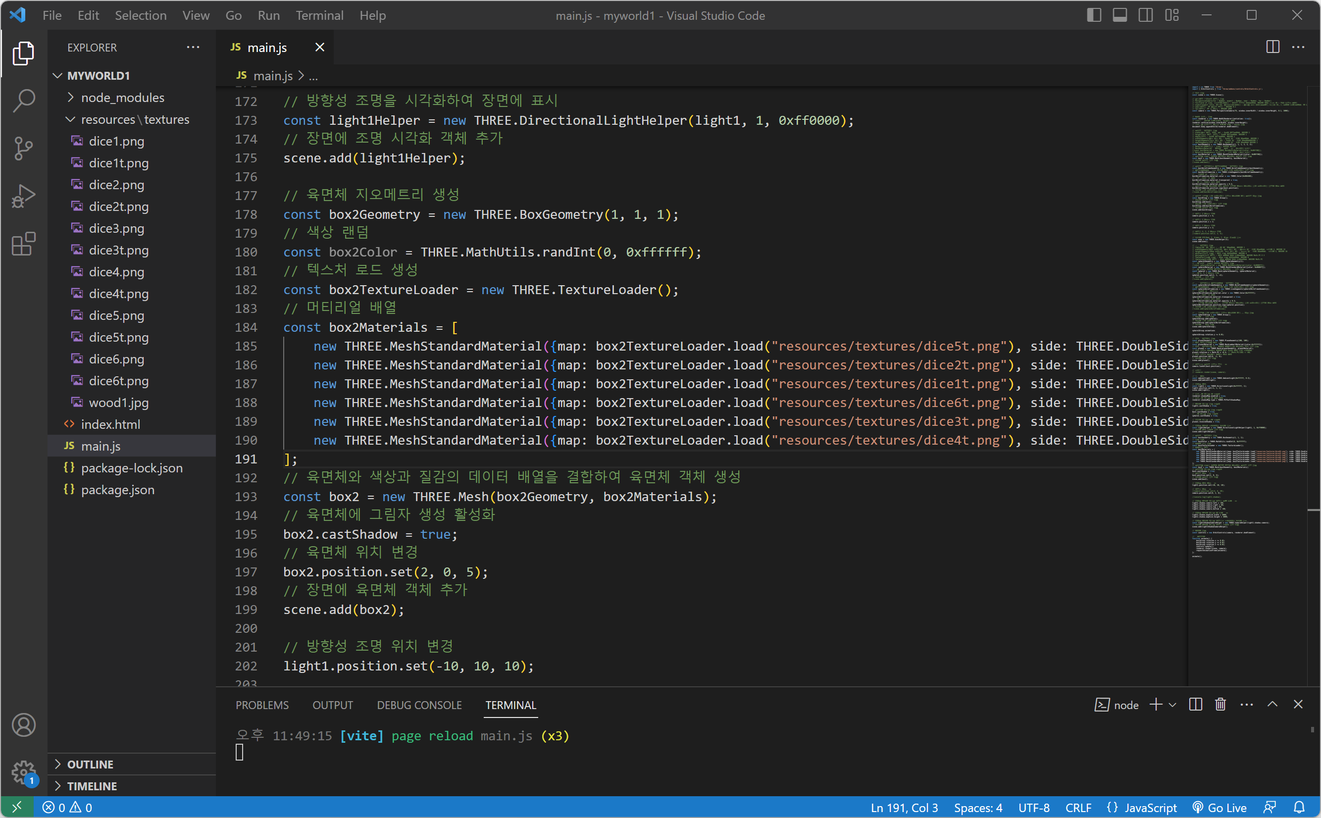 각각의 Material(머티리얼)에서 주사위 이미지가 앞면과 뒷면에서 렌더링 되도록 side 속성을 THREE.DoubleSide로 추가합니다. (기본적으로 side 속성은 THREE.FrontSide입니다.)