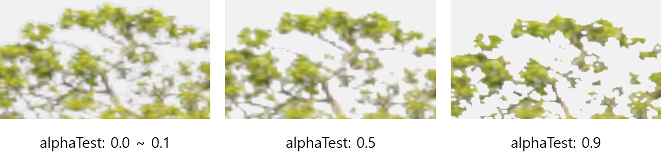 Material(머티리얼)의 alphaTest 값을 각각 0.1, 0.5, 0.9로 설정하였습니다.