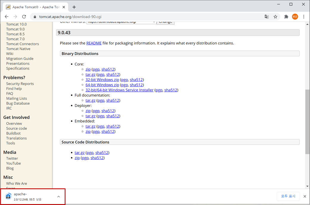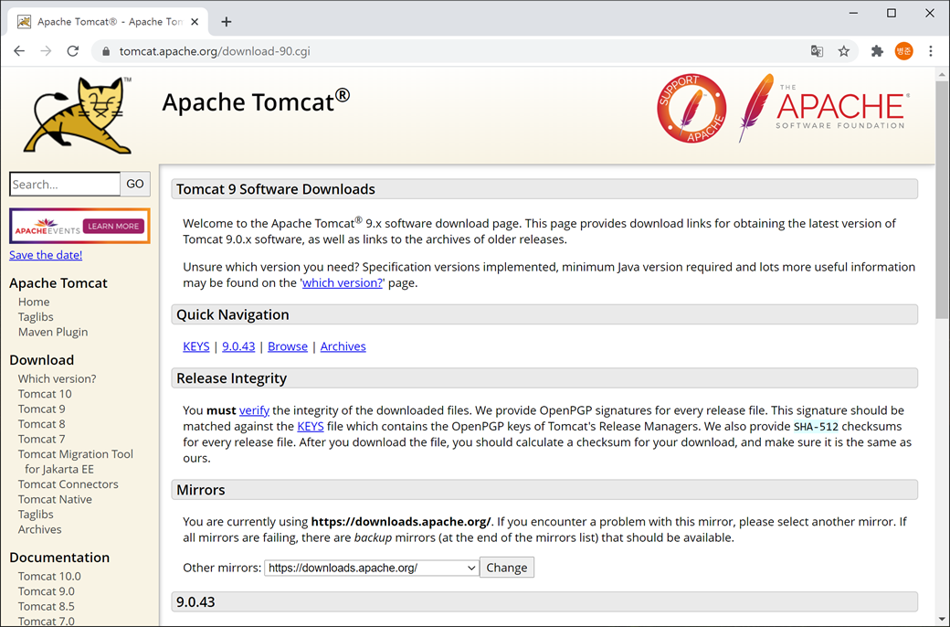 톰캣 9의 마지작 버전은 Tomcat 9.0.43입니다.