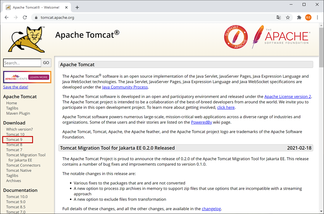 1. 아파치 톰캣 홈페이지(https://tomcat.apache.org/)를 접속합니다.