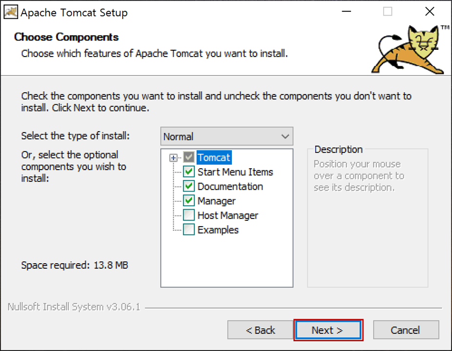 "Choose Components" 컴포넌트 선택 창에서 "Next >"버튼을 클릭합니다.
