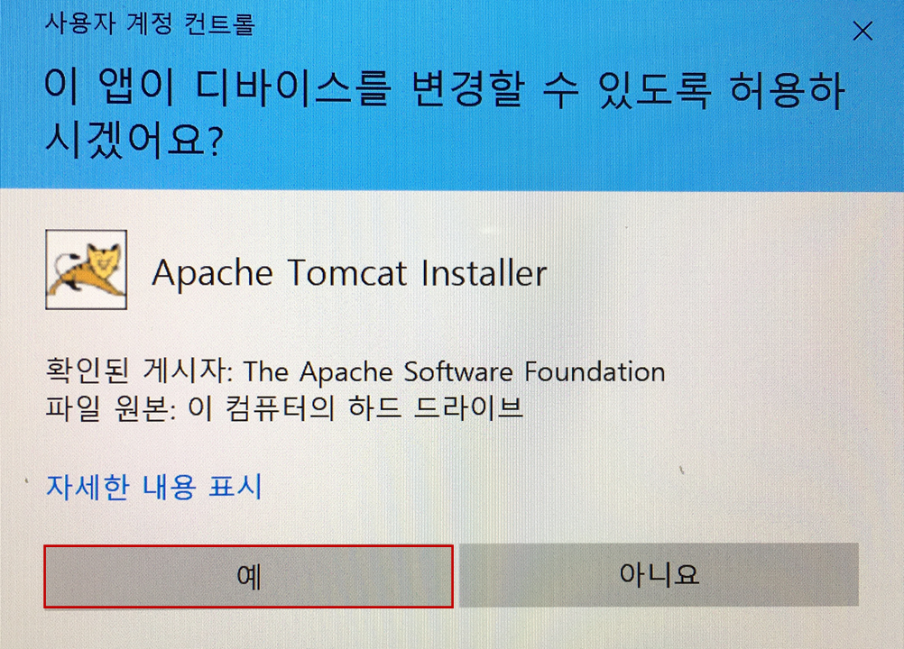 "이 앱이 디바이스를 변경할 수 있도록 허용하시겠어요?"의 확인 창이 나타나면 "예"버튼을 클릭합니다.