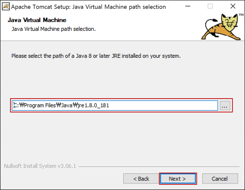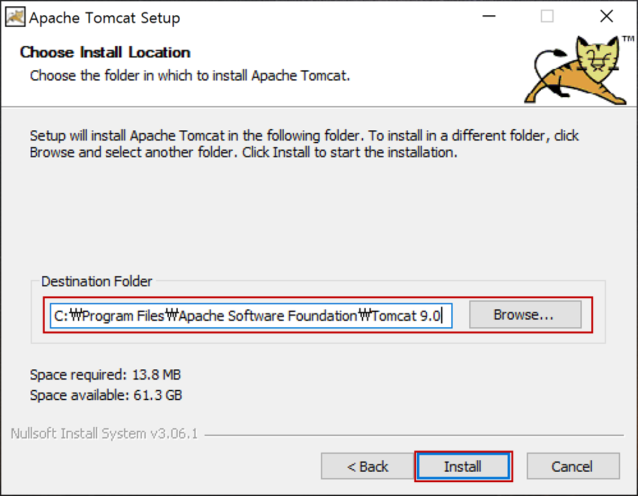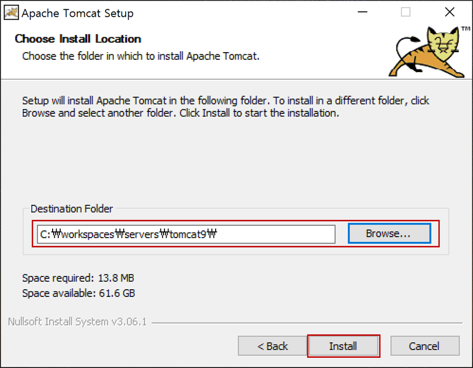 "Choose Install Location" 설치 경로 창에서 톰캣이 설치된 경로를 설정하고 설치합니다.