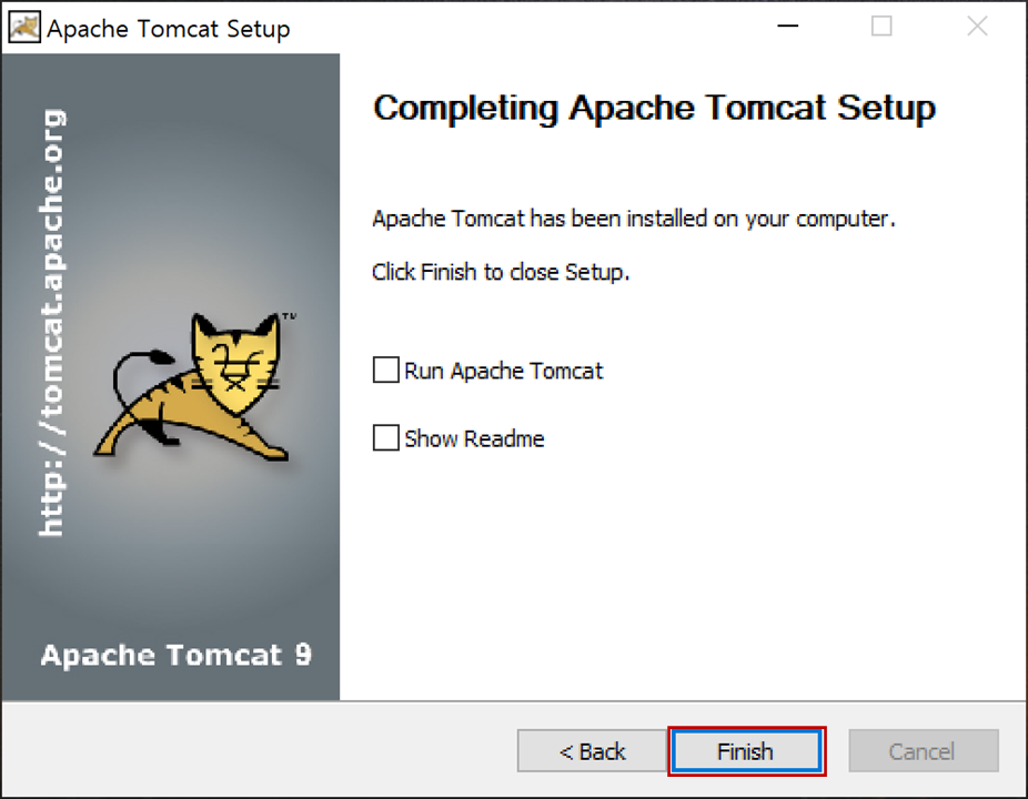 "Run Apache Tomcat"과 "Show Readme"를 체크를 해지하고 "Finish"버튼을 클릭합니다.