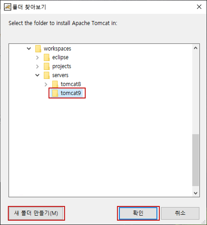"Browse..."버튼을 클릭하여 이전에 서버가 설치된 폴더("C:\workspaces\servers")에서 "새 폴더 만들기"버튼을 "tomcat9"폴더를 생성한 후 "확인"버튼을 클릭합니다.