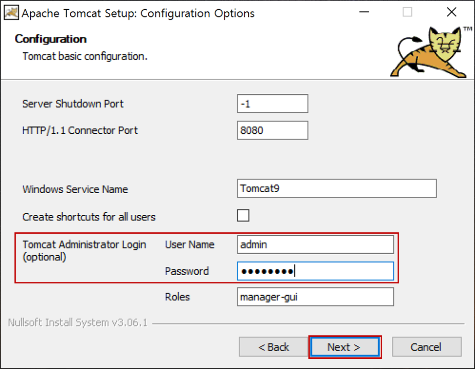 "Configuration" 구성 창에서 톰캣 관리자 로그인 계정 정보인 "User Name"과 "Password"를 입력하고 "Next >"버튼을 클릭합니다.
