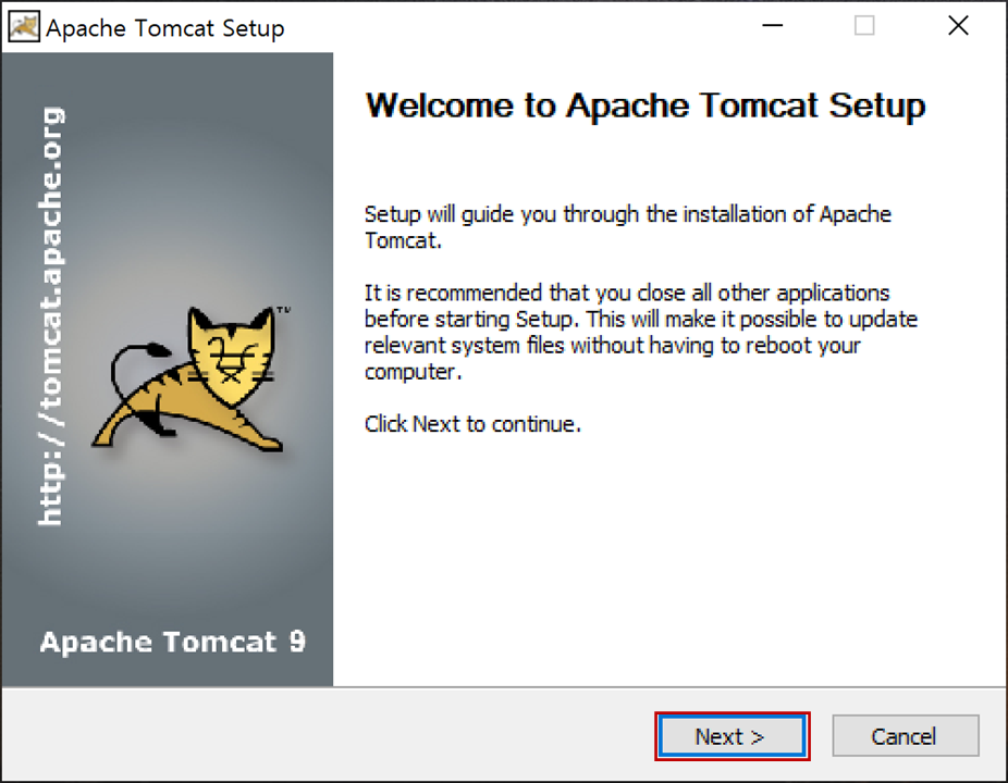 2. "Welcome" 설치 안내 창에서 "Next >"버튼을 클릭합니다.