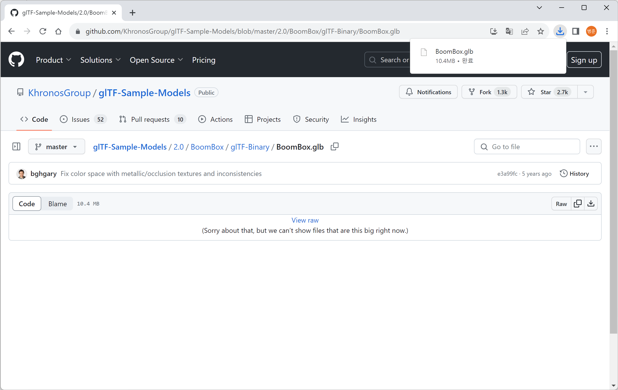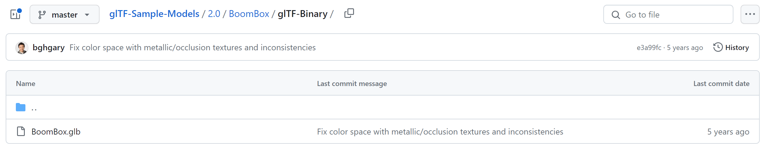 2. GLTF로더로 로드할 모델을 glTF-Sample-Models(https://github.com/KhronosGroup/glTF-Sample-Models/blob/master/2.0/BoomBox/glTF-Binary/BoomBox.glb)에서 다운로드합니다.