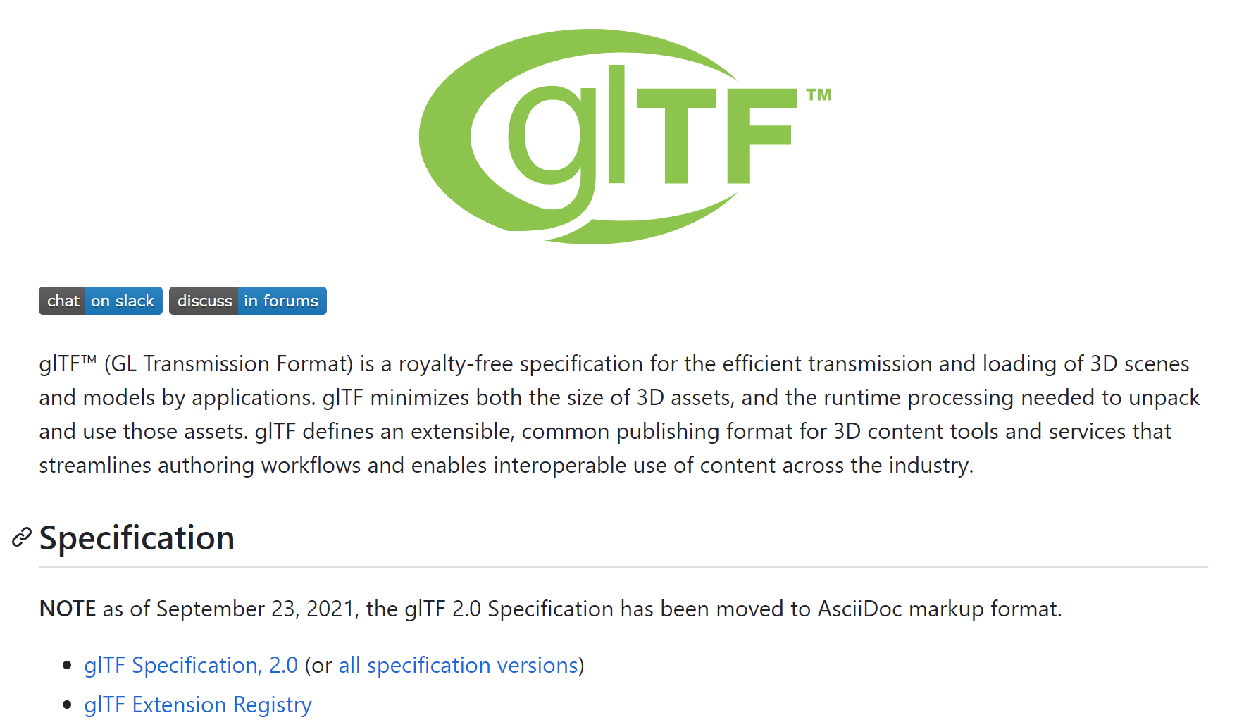 glTF는 제작 작업 절차를 간소화하고 산업 전반에서 콘텐츠가 서로 호환되어 사용(상호운용)이 가능하게 3D 콘텐츠 도구 및 서비스를 위한 확장 가능한 공통 배포 포맷을 정의하였습니다.