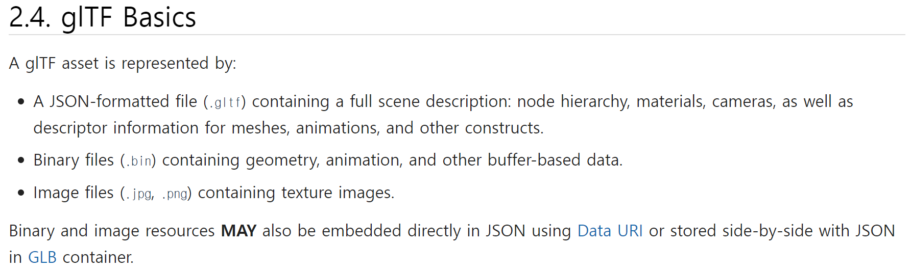 자세한 설명은 glTF(https://github.com/KhronosGroup/glTF)를 참조하시기 바랍니다.