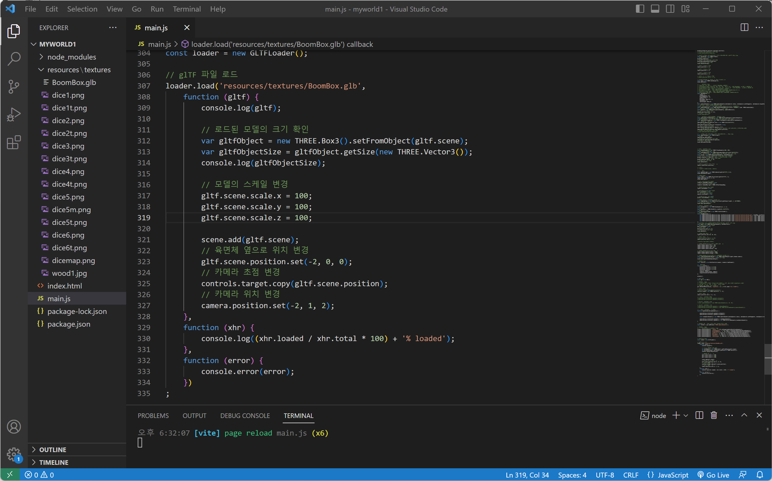 onLoad 함수에서 로드된 모델의 객체를 가져옵니다. 그리고 객체의 크기를 가져와서 콘솔 로그로 출력합니다.