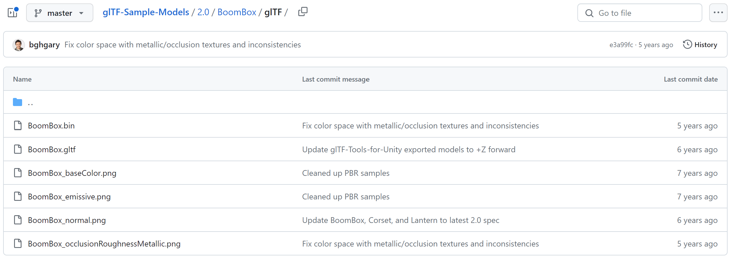 즉, 아래 샘플(https://github.com/KhronosGroup/glTF-Sample-Models/tree/master/2.0/BoomBox/glTF)처럼 glTF Asset(에셋, 자산)은 3개의 유형으로 JSON 포맷 파일 (.gltf), 데이터 파일 (.bin), 이미지 파일 (.jpg, .png, 등등)로 구성됩니다.