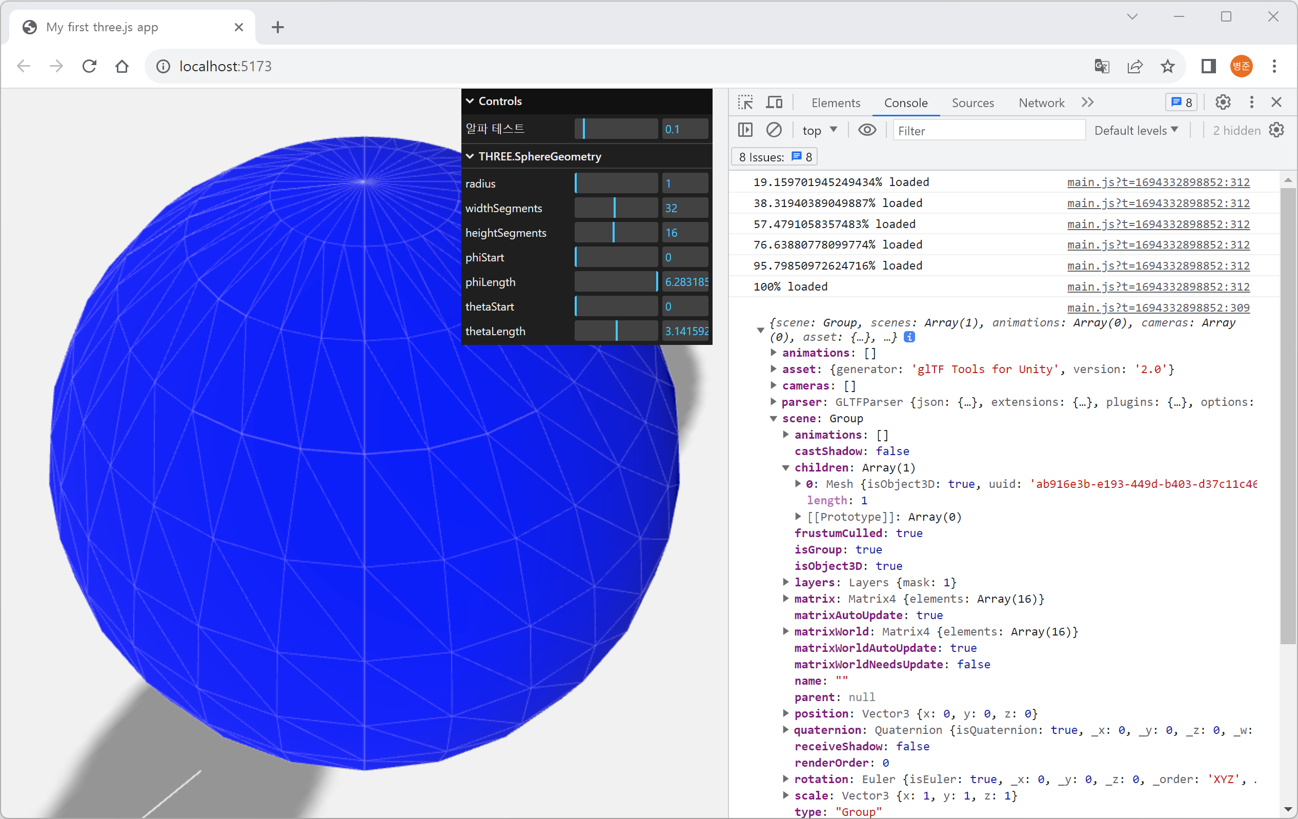 그러면 콘솔 로그에 로딩 프로세스가 출력되고 glTF의 JSON 정보가 출력됩니다.