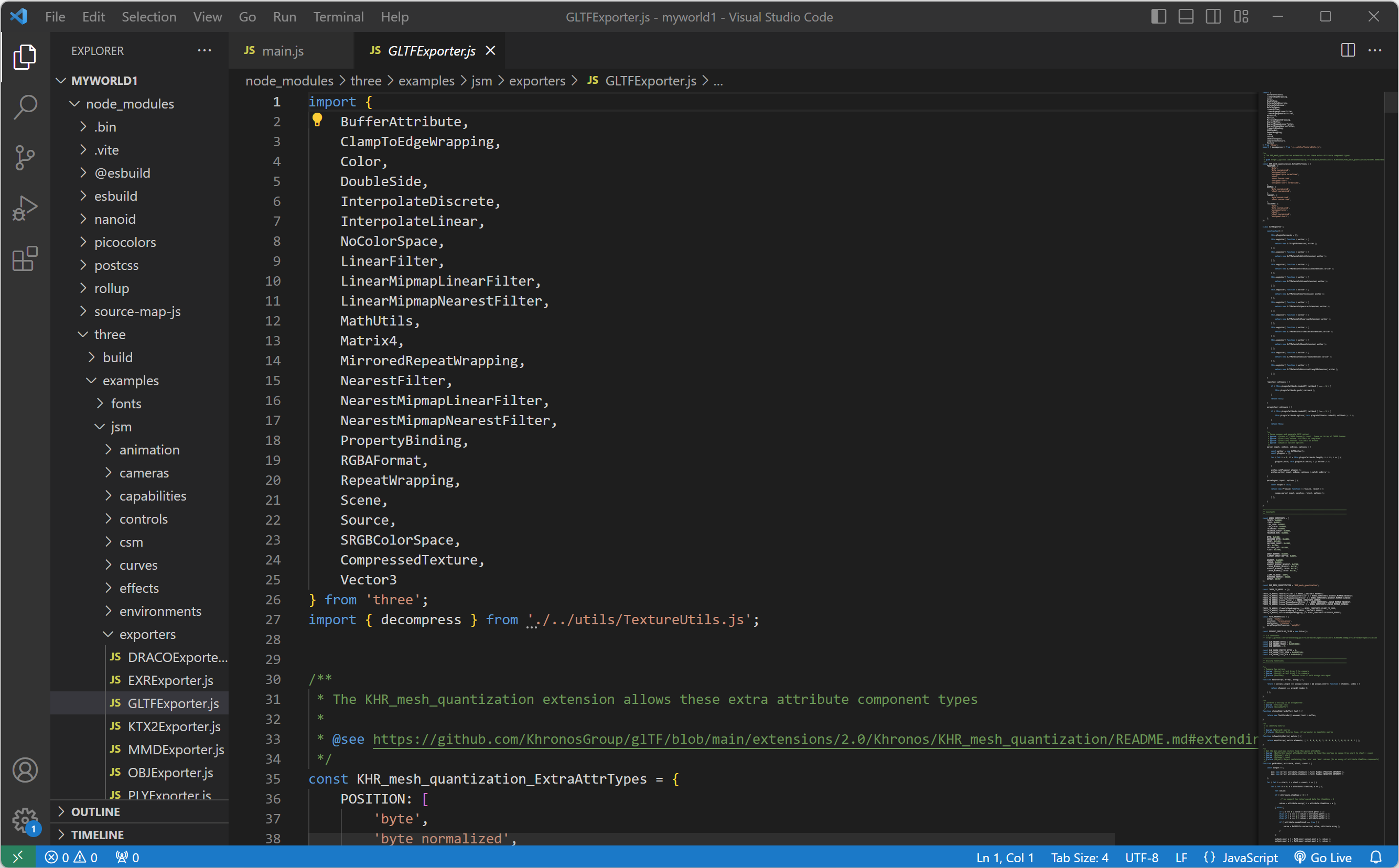 1. import를 통해 GLTFExporter(GLTF익스포트) 모듈을 가져옵니다. GLTFExporter(GLTF익스포트)는 Scence(씬, 장면)이나 Scence(씬, 장면)에 있는 Object(객체)들을 glTF 포맷으로 추출합니다.