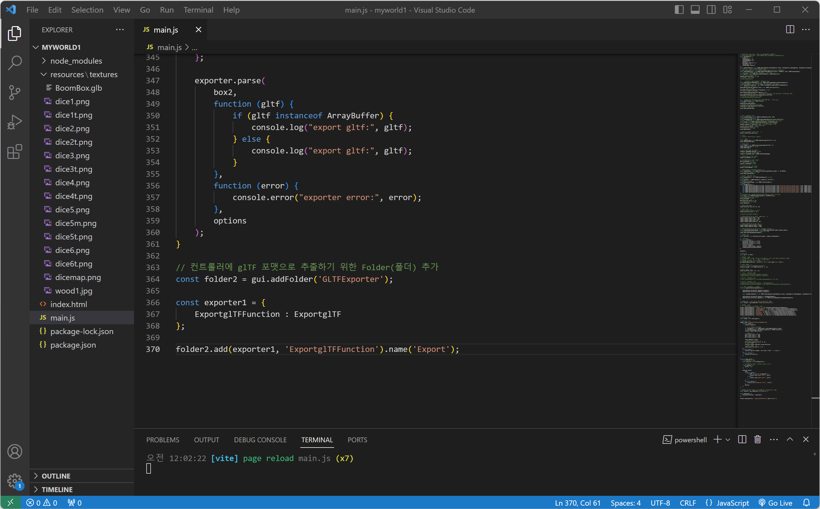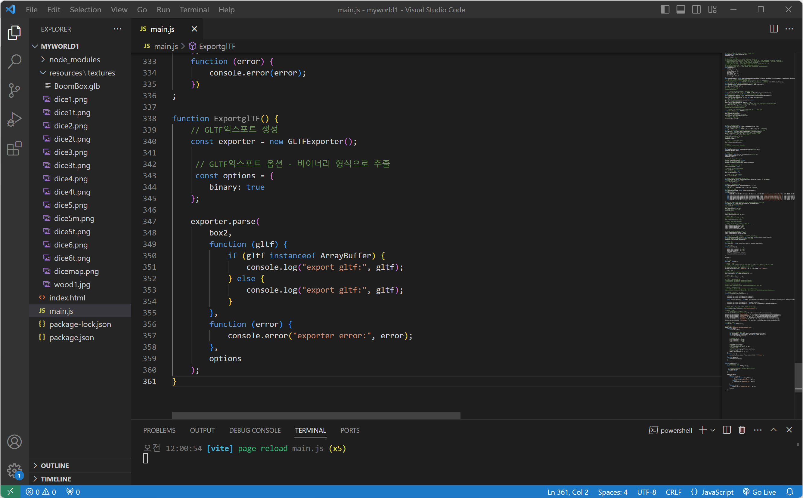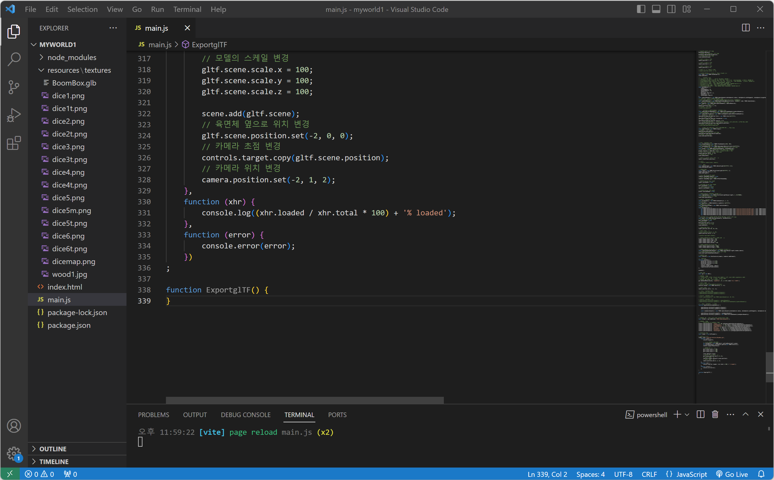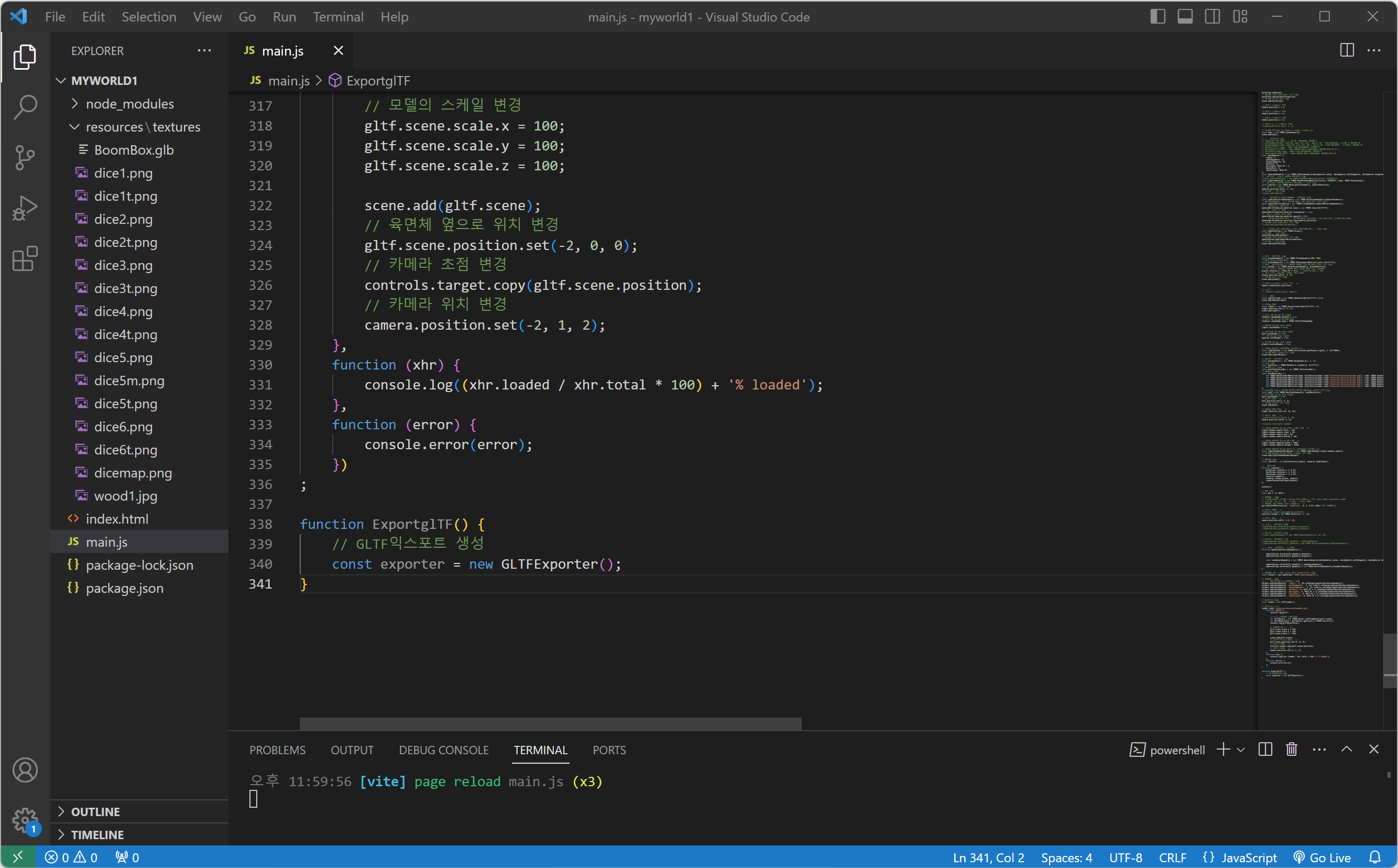 3. glTF 포맷으로 추출하기 위해 함수에 GLTFExporter(GLTF익스포트)를 생성합니다.
