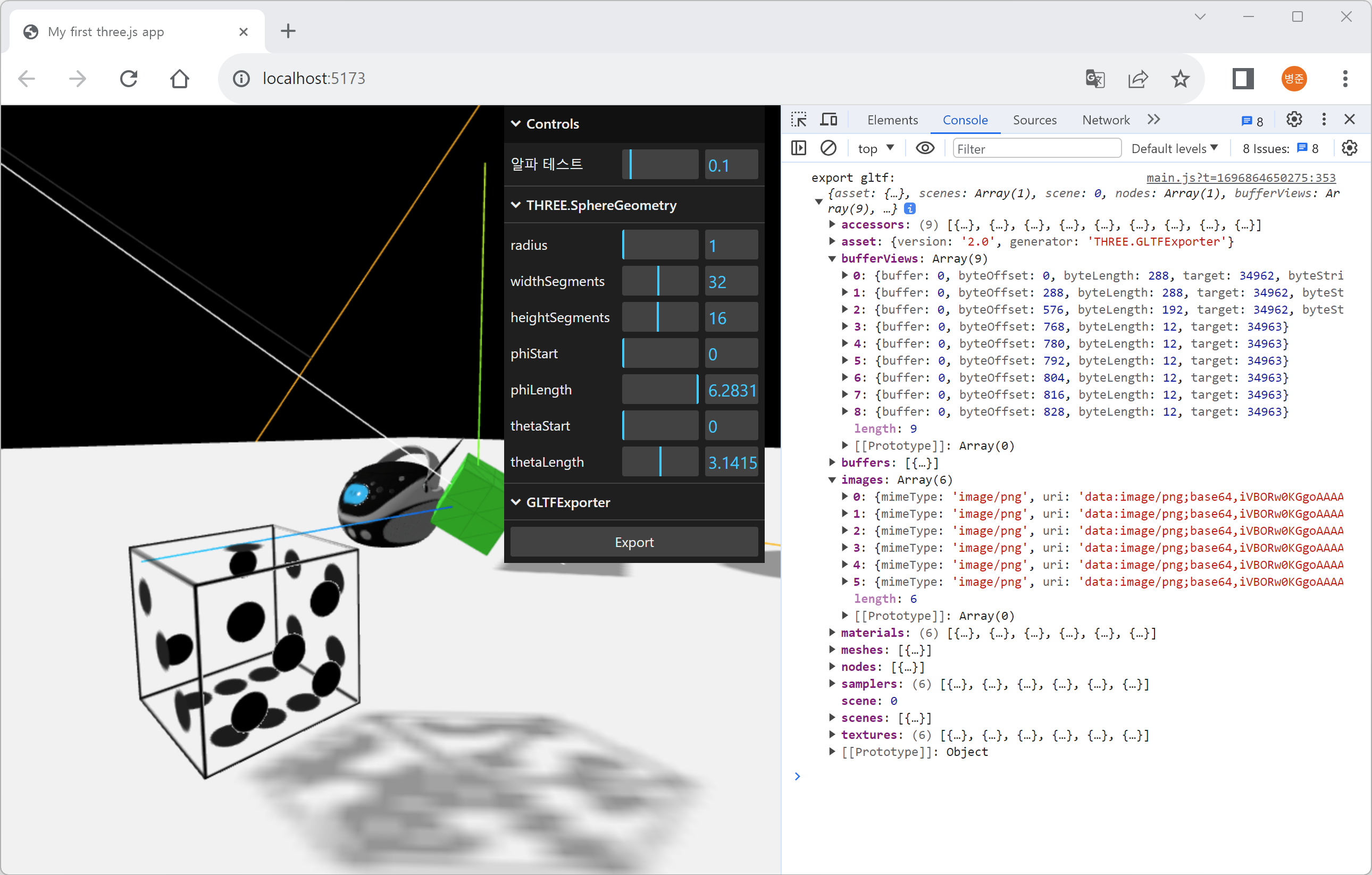 6. Controls에서 "Export" 버튼을 클릭하면 콘솔에 바이너리(ArrayBuffer)로 추출된 glTF 정보가 출력됩니다.