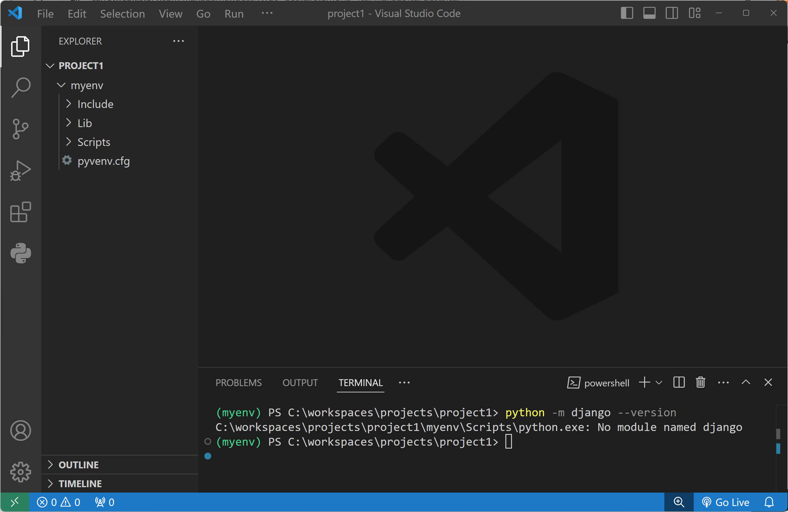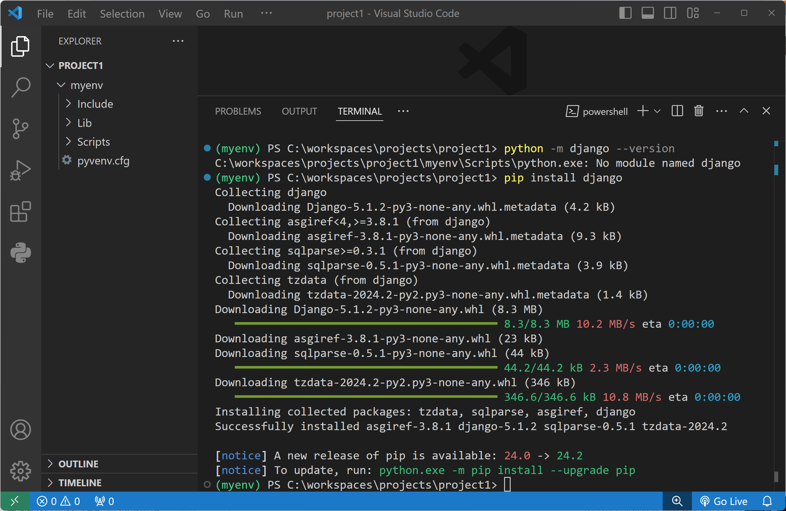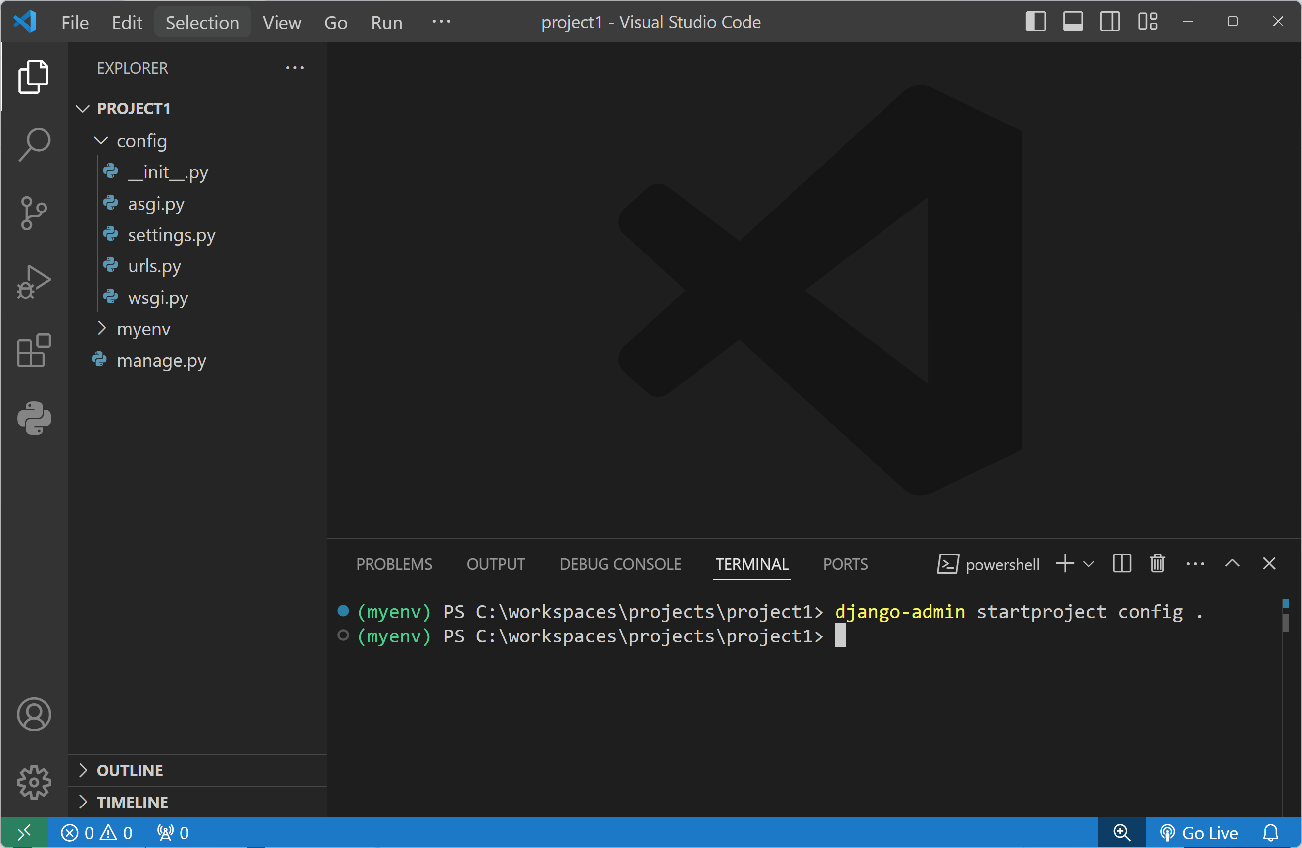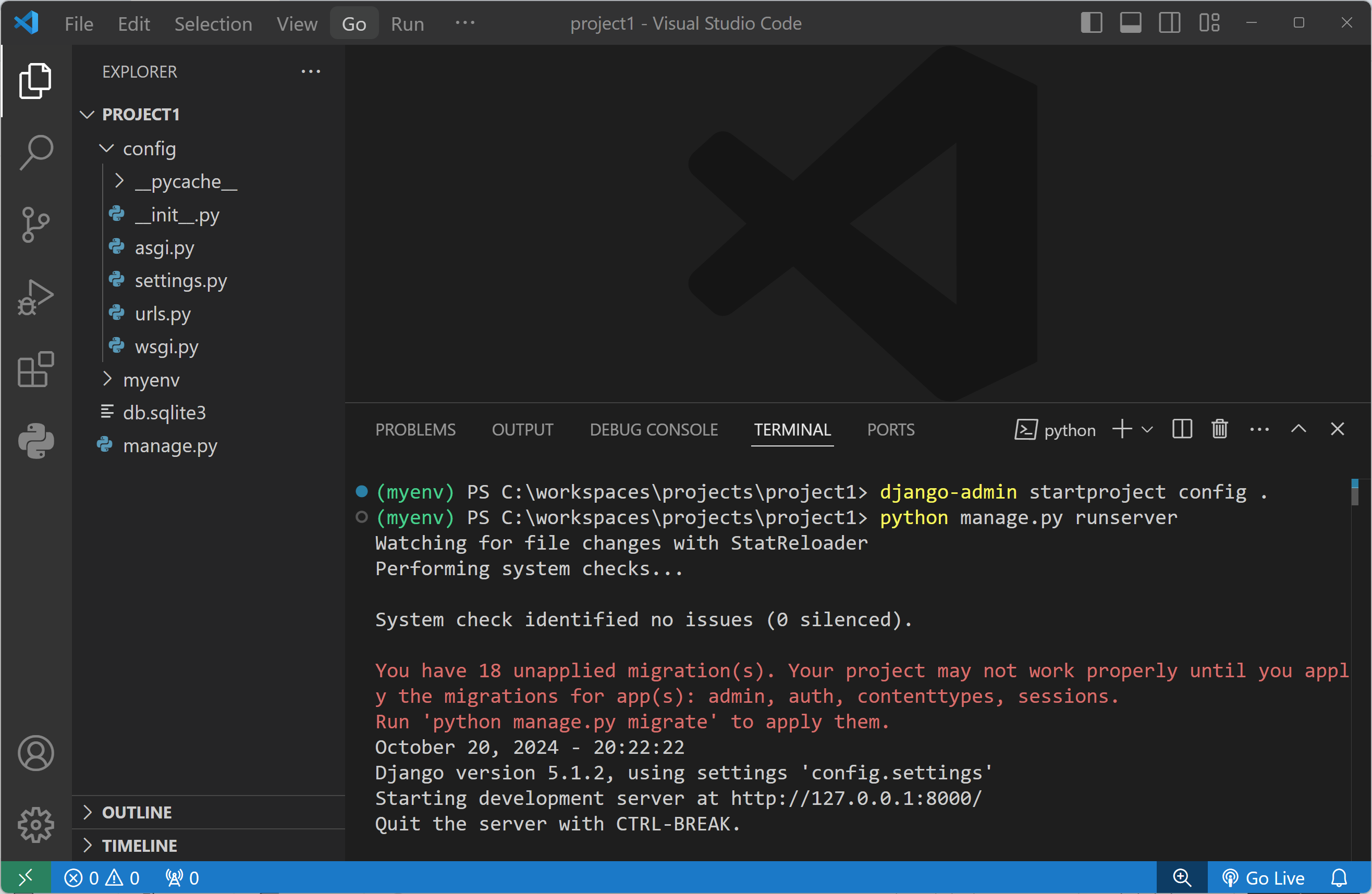 EXPLORER를 보면 PROJECT1 폴더에 config 폴더(프로젝트 패키지 파일들이 있는 폴더)와 manage.py(프로젝트 관리 파일)가 생성된 것을 확인할 수 있습니다.